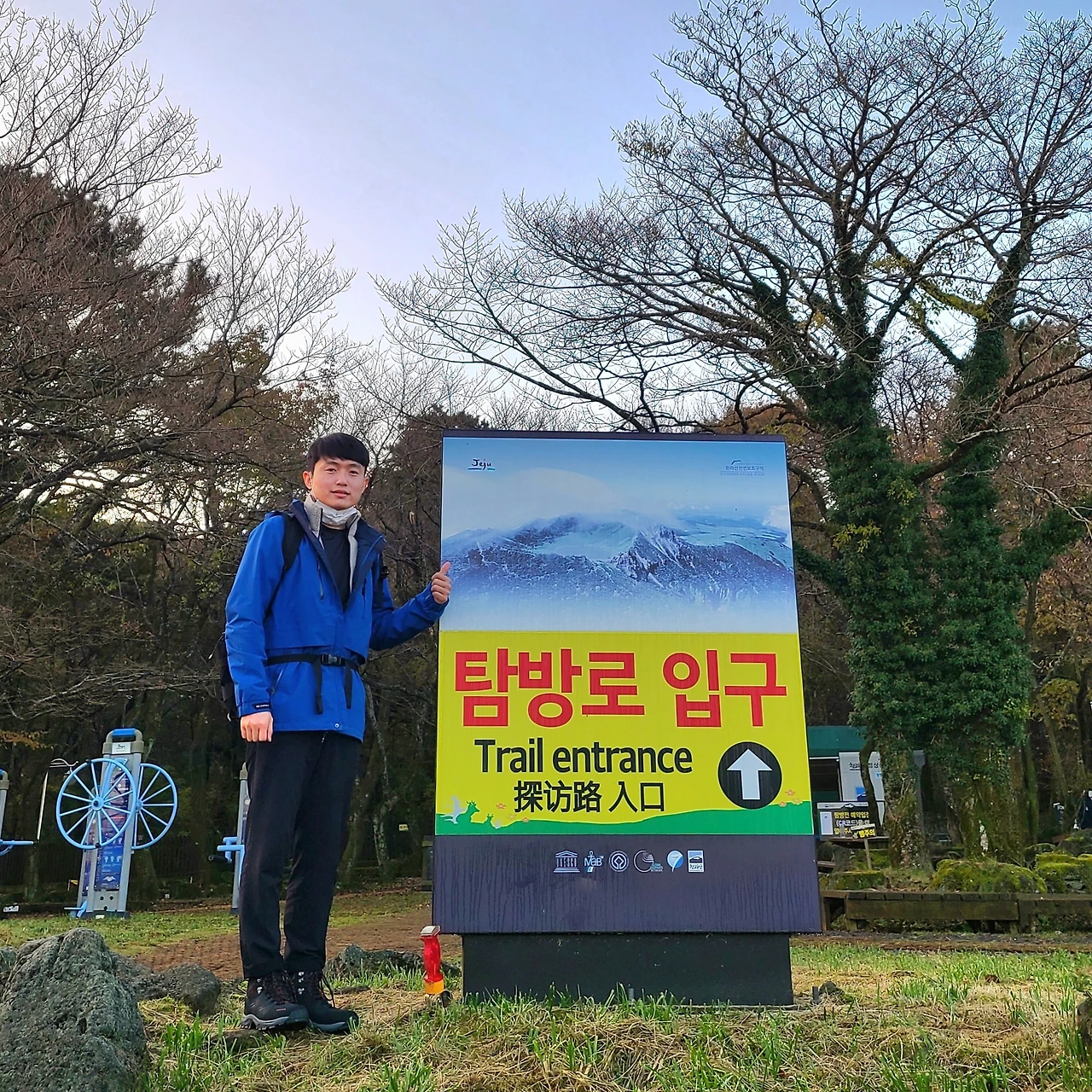 새벽 4시 기상. 후딱 씻고 편의점에서 컵라면, 주전부리, 물을 샀다. 에너지를 충전해야 했기에 맥모닝 세트를 사서 차 안에서 먹으며 이동. 캄캄한 516 도로를 지나 무사히 관음사 지구 야영장 주차장에 도착했다. 6시 출발은 좀 이른듯하여 차에서 조금 멍 때리기로 했다. 한라산 국립공원 표지판 지도를 확인하고 출발 인증사진을 남긴 후, 아침 7시 반 호기롭 출발!