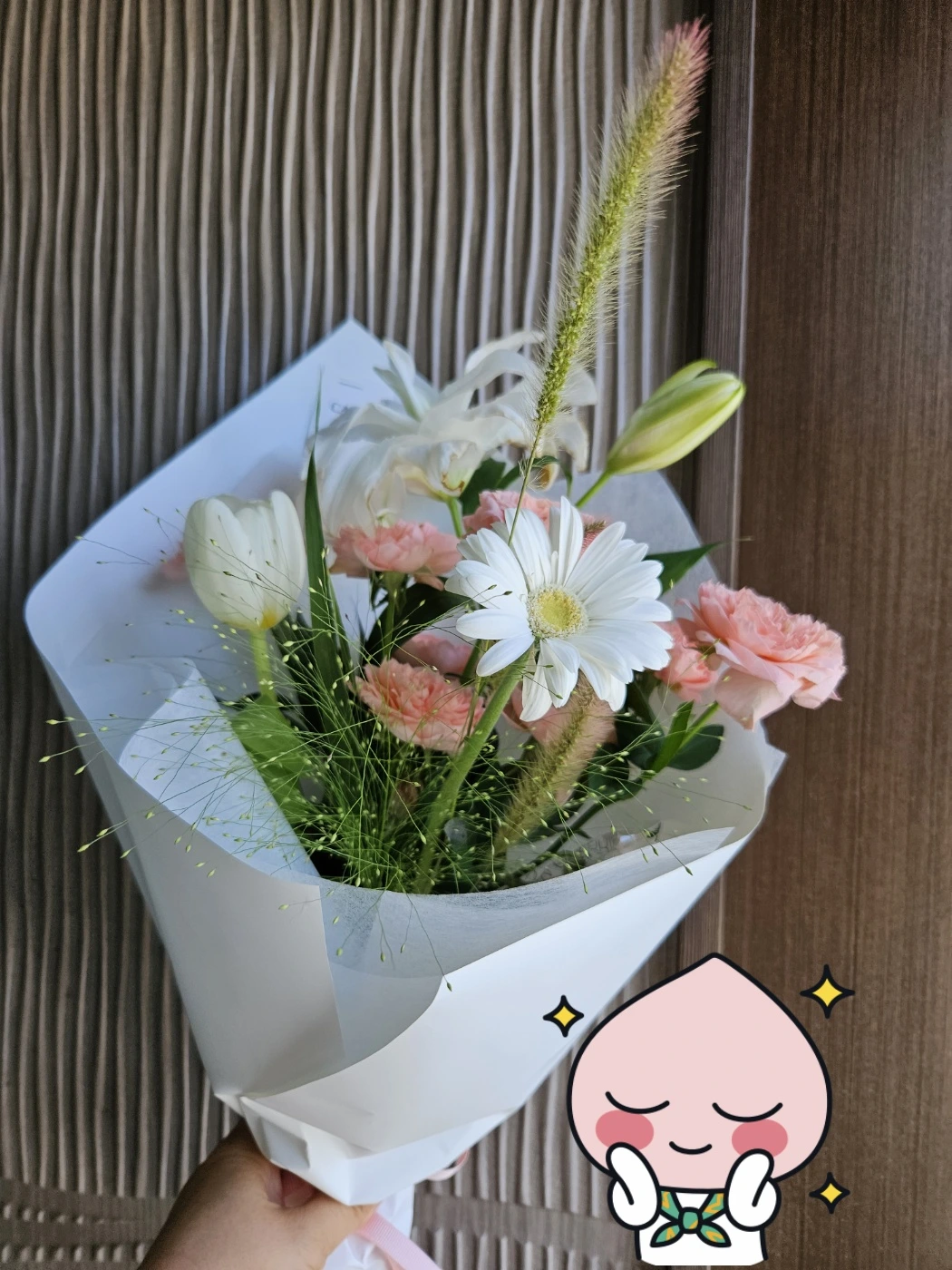 화사한 꽃다발을 든 그의 표정이 울컥하면서도 눈부셨다.