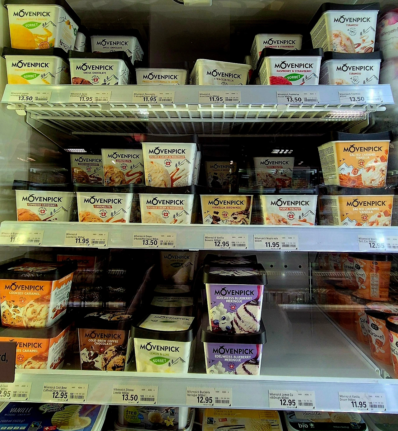 아이스크림: Movenpick은 스위스 브랜드 아이스크림으로 일부 카페와 아이스크림 트럭에서 쉽게 볼 수 있다. Coop 마트에서도 다양한 맛을 판매한다. 우리가 꼽은 최애는 솔티드 카라멜 바닐라 (salted caramel vanila) 맛이다. (개인적으로 피스타치오 맛의 젤라또를 애정하나, Movenpick은 그보다 다른 맛을 추천한다.)
