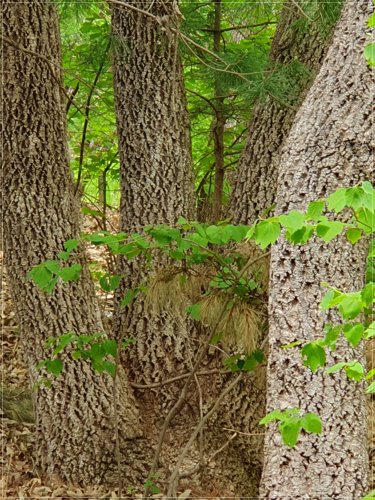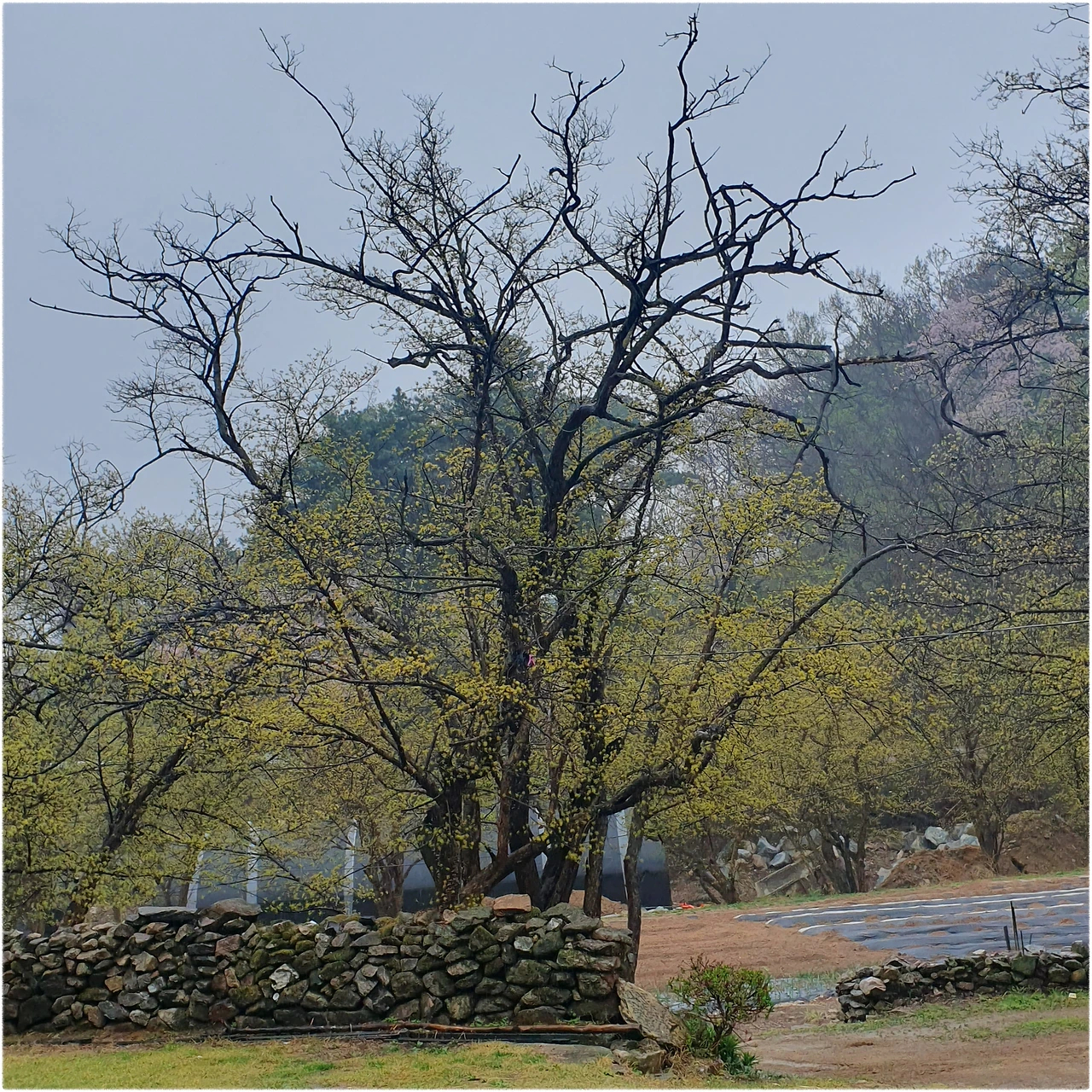 마을 뒤에 숲이 있다.(2023.4.5.) 그는 그저 그런 마을의 뒷산이라 생각했다. 막걸리를 몇 잔해서 차를 운전하여 돌아갈 걱정이었던 그는 술도 깰 겸 별생각 없이 숲으로 갔다. 그에게 친숙한 참나무들이 비에 젖어 있었고 분홍 꽃을 피운 개복숭아가 간혹 눈길을 끌었다. 숲속에는 작지만 제법 모양을 갖춘 폭포가 산벗나무의 어깨를 짚고 그를 반겼다. 그와 함께 가는 이들은 참나무 6형제에 대해 말하고 싶은 대로 말하며 숲속을 걷는데 그 속도는 거북이와 경주해도 뒤질 정도였다. 시간이 그들 머리 위로 내렸다. 숲속으로 들어갈수록 키 큰 소나무, 굴참나무가 의젓하다. 옆으로 누운 소나무를 받치고 있는 물푸레나무의 모습이 보이자 그들 중 제일 형님이 한 말씀 하신다. “저들은 부모와 자식의 관계처럼 보여. 체구 작지만, 아래에서 밭치고 있는 저 물푸레나무는 부모이고, 덩치가 크지만, 위에 있는 소나무가 자식이야. 그저 자식들을 위해 죽도록 힘을 다하는 게 부모지”. 듬직한 목소리를 따라 큰 울림이 함께 왔다. 그 길로 좀 더 가니 오래 살아서 커다란 오동나무가 언덕에 줄지어 서 있는데 그들을 칡넝쿨이 뒤덮고 있다. 잎사귀가 없는 봄인데도 하물며 답답한데 칡의 잎이 무성한 6~8월에는 오죽할까? 다음에 다시 이 숲에 오면 낫을 들고 와서 오동나무가 오동나무다운 모습을 보이도록 미안하지만, 칡넝쿨을 잘라주리라. 그런저런 생각을 하며 걷다 보니 신라시대부터 있었다는 절집에 다다랐다. 거기에는 500년 된 은행나무가 하늘과 땅을 오가는 전령처럼 늠름하게 서 있다. 두 마리의 흰 진돗개가 낯설다고 컹컹 짓는데 그는 그들이 하나도 낯설지 않았다.