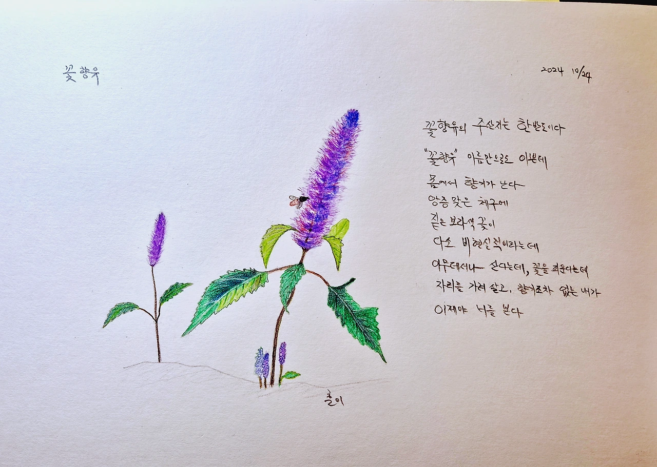 가만히 바라보다 4B 연필을 들었다. 그림을 그리기 시작하자 그냥 스쳐 지나는 그냥 그런 풀이었던 꽃향유가 요술 방망이를 내게 휘두른 듯 마음속에 특별하게 자리 잡는다.