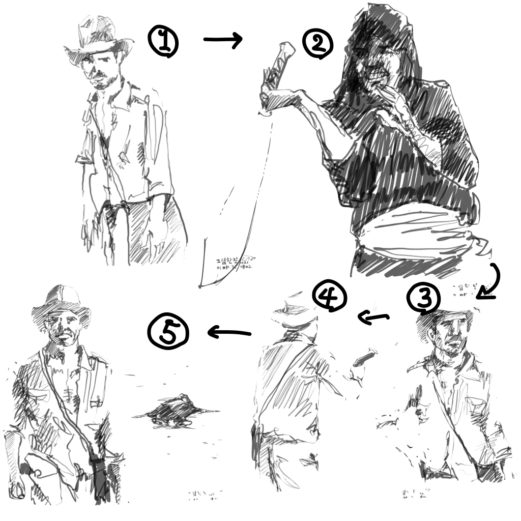 인디아나 존스는 제가 가장 좋아하는 블록버스터 영화입니다. 아직도 시리즈가 끝나지 않고 다음 시리즈가 나온다고 하니 정말 기쁩니다. 물론 예전만큼 재미는 없을 것 같지만 그래도 고마울 따름입니다. 위의 인디아나 존스 두 번째 그림은 시리즈 중 가장 웃기는 명장면입니다. 큰 칼을 휘두르며 위협하는 악당을 그냥 총한방에 제압하는 장면입니다. 이 장면의 비하인드는 해외 로케이션으로 건강이 나빠진 해리슨 포드가 심한 액션이 어려워지자 임기응변으로 변경된 장면이라고 합니다. 의외로 명장면들 중 애드리브나 임기응변의 순간들이 많은 것 같습니다.