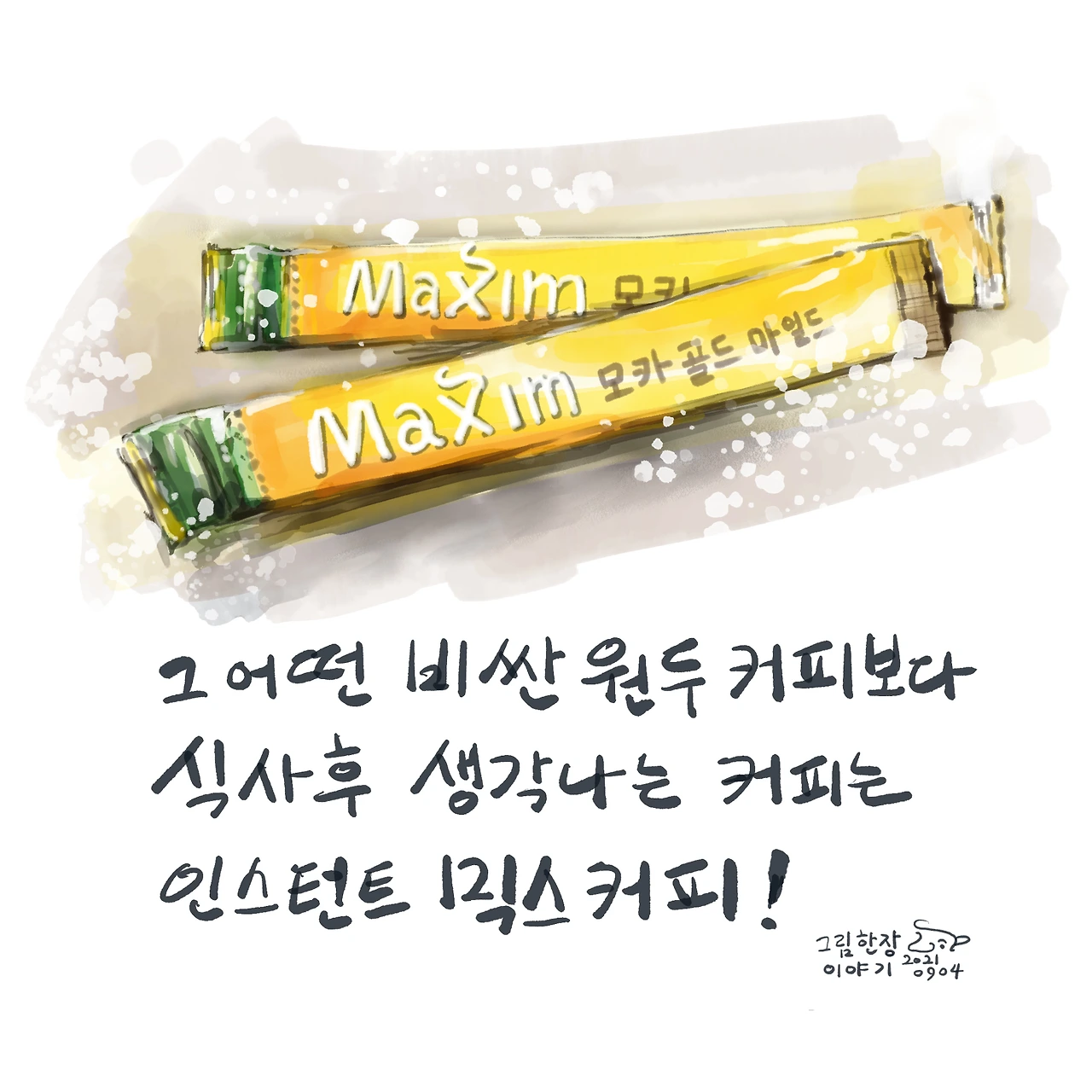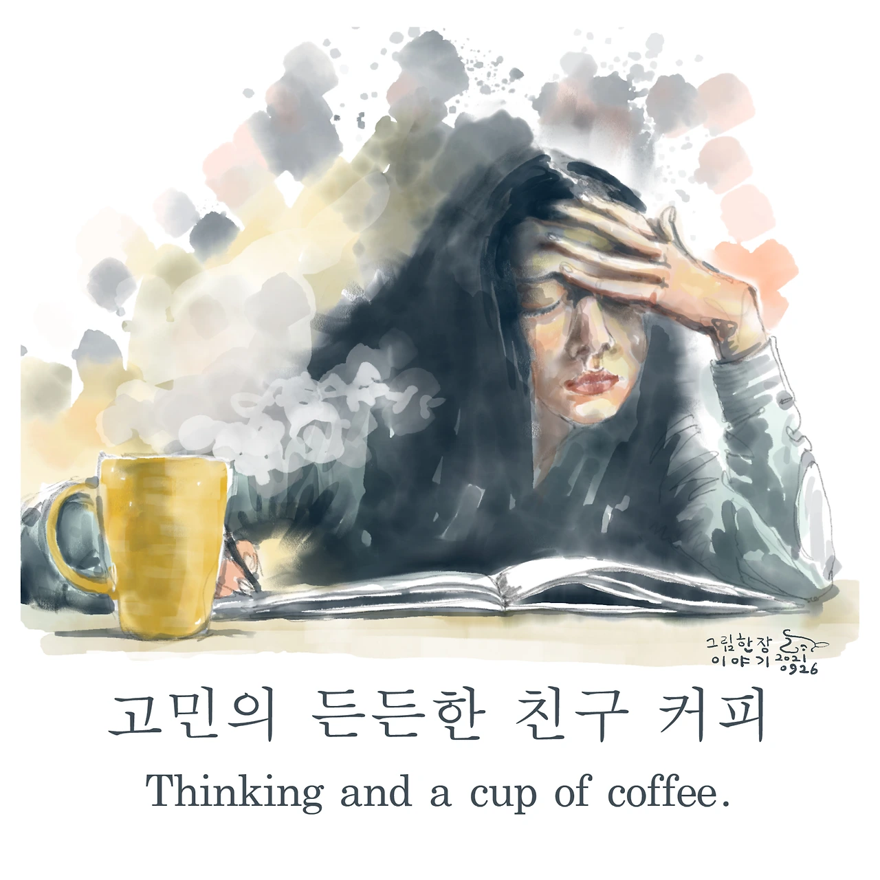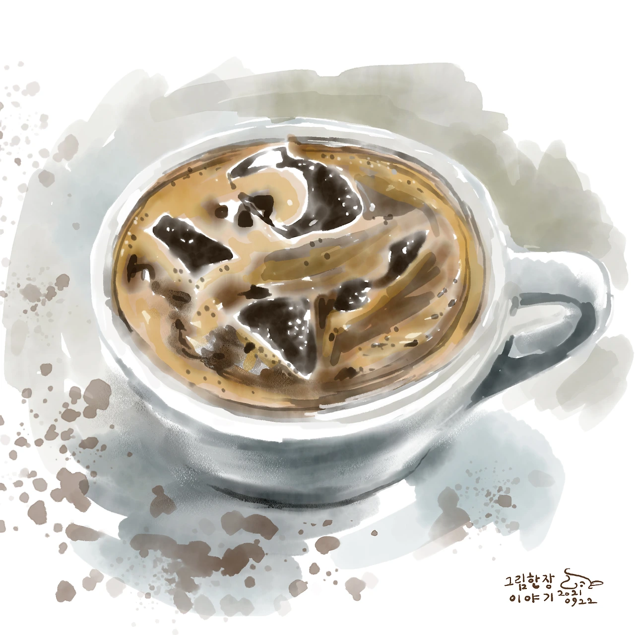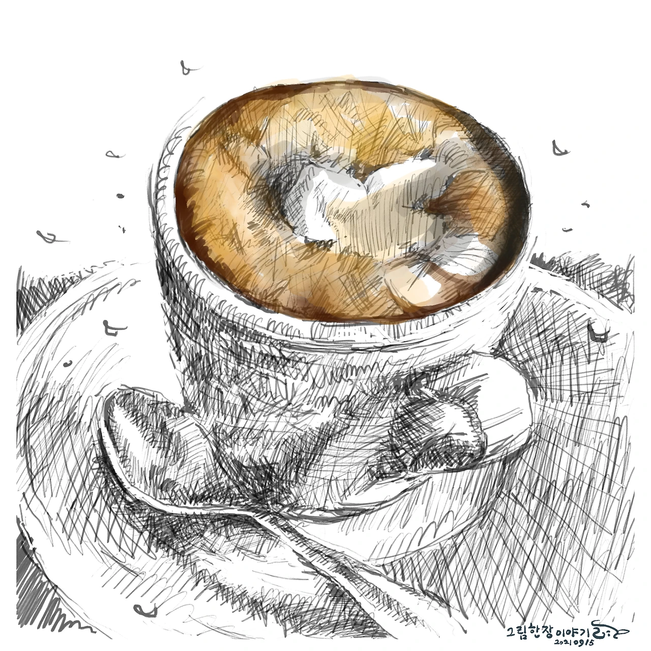"그림 한 장 이야기" 9월 드로잉 주제는 커피였습니다. 커피 좋아하시나요? 솔직히 저는 커피의 맛을 잘 모르겠어요. 유명 커피 전문점이나 핫한 커피숍의 커피들이 무엇이 다른지 잘 모르겠습니다. 인스턴트 믹스 커피만 마셨을 때는 저에게 커피는 그냥 단맛이었습니다. 그러다 커피전문점에서 커피를 사 먹게 되었고 그때부터 저에게는 커피는 쓴맛입니다. (물론 시럽을 왕창 타면 다시 단맛입니다.) 이런 제가 왜 커피를 마시는 것일까요?