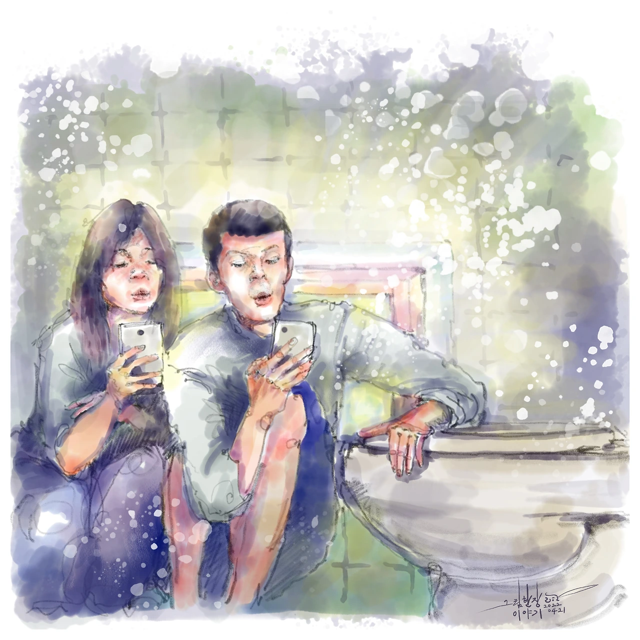 그림을 직접 그리는 재미가 바로 이런 것입니다. 내 손에서 무엇이 나올지 모르는 불확실성! 그리고 그것은 무한한 상상력으로 이어집니다. 스마트폰 와이파이를 찾는 절실한 표정을 실감 나게 그리고 싶었습니다. 그러다 보니 배우들을 비슷하게 그리는 것은 실패하고 말았네요. 배우들의 생김새가 바뀌니 또 다른 이야기가 눈에 들어옵니다.