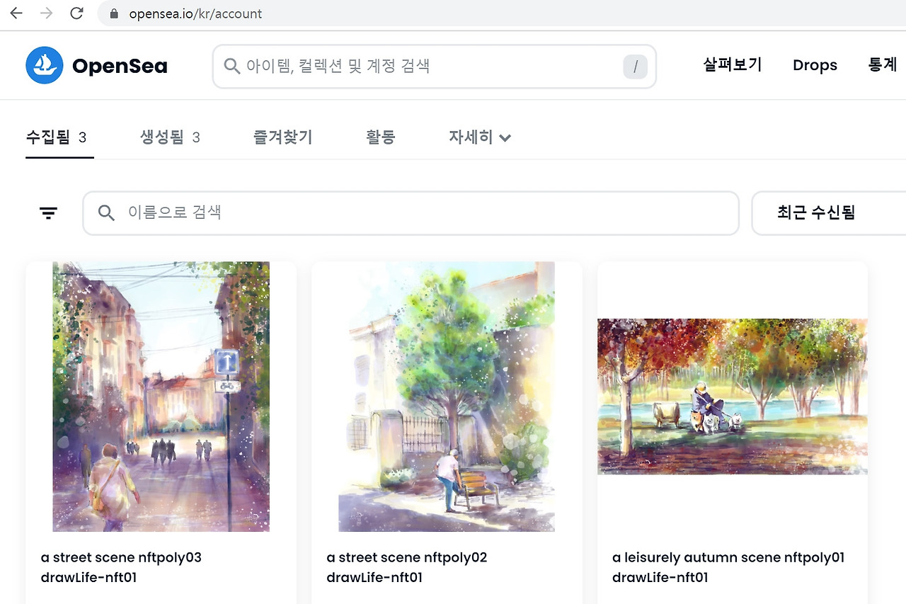 드디어 오픈씨에 저의 그림이 NFT아트가 되어 올라갔습니다. 아직 제 작품을 팔 생각은 없습니다. 작품들을 좀 더 저의 소유로 간직하고 싶은 마음이 강합니다. 그리고 지금 팔겠다고 해도 팔리지 않을 것이고요. 구체적으로 NFT를 어떻게 활용해야 하겠다고 계획한 것도 아닙니다. 당분간 오픈씨는 저의 작품 갤러리로서 기능을 할 것 같습니다.