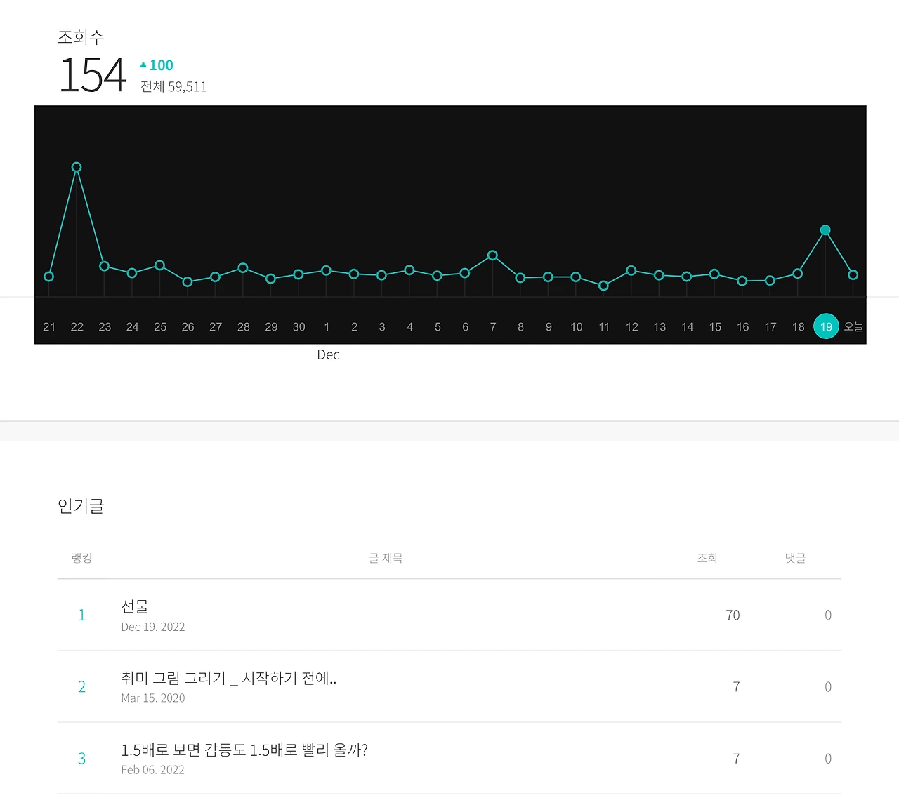 “강아지가 키우는 남자 - 선물” 콘텐츠의 조회수가 예상외로 높게 나왔다는 것이었습니다. 이유가 너무 궁금해서 여러 경로로 그 이유를 찾아봤습니다. 정확한 것은 아니지만 “카카오 뷰”에 올렸던 보드가 드디어 노출이 많이 된 것 같더군요. 결국 운이 좋았던 겁니다. 다시 한번 마음속에 새기고 있던 그 말이 떠올랐습니다. “과정은 실력이고, 결과는 운이다.” 콘텐츠의 질적인 수준이 떨어진다고 해도 과정을 반복하다 보면 결과라는 운이 찾아온다라는 것을 다시 한번 체감합니다. 과정은 실력이니 반복하면 실력은 높아질 겁니다. 그러면 결과라는 운의 확률도 조금은 높아지겠죠.