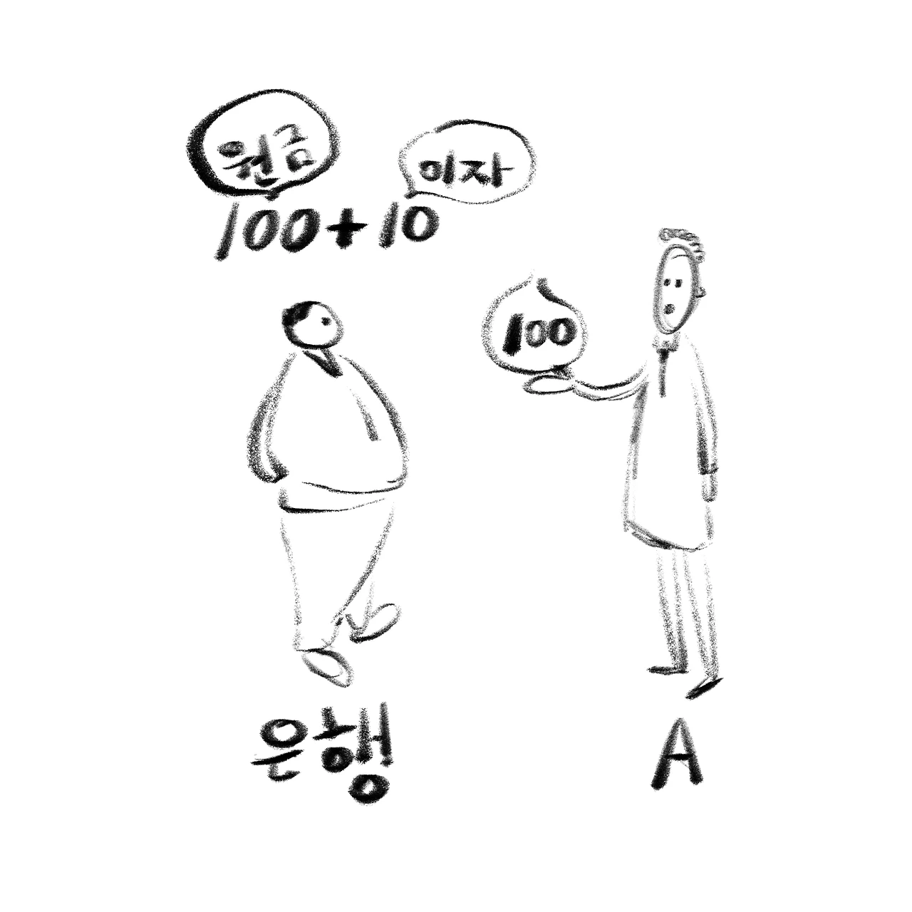 은행은 돈을 주는 게 아니고 빌려주는 것이었다. A는 100원을 빌렸다. 그런데 100원 갚으면 되는 게 아니고 10원을 더해서 갚아야 한다고 한다. 그 10원은 이자라고 했다. A는 동의했다. 그렇게 원금 100원을 빌렸다.