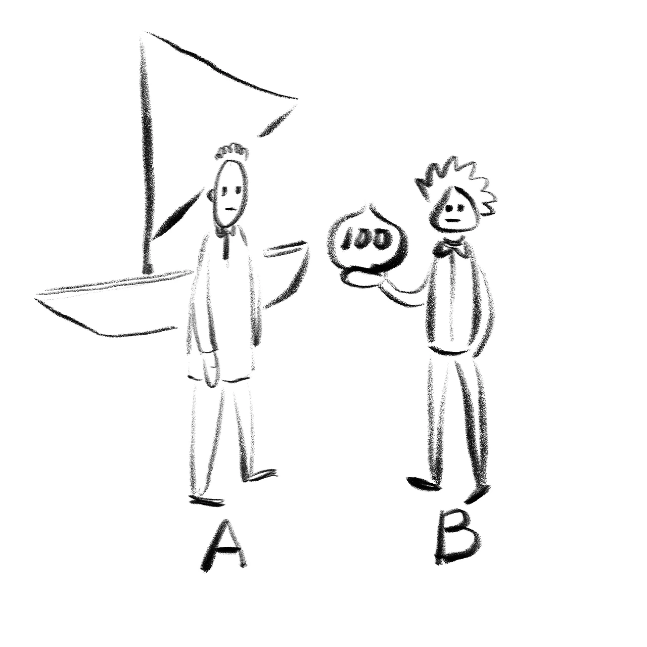 A는 B에게 가서 배를 100원에 샀다. 그리고 바다에 나가서 물고기를 잡았다. 섬으로 돌아온 A는 물고기를 팔기 시작했다. 섬에서 유일하게 돈이 있는 사람은 B다. B는 전 재산 100원을 A에게 주고 물고기를 샀다.
