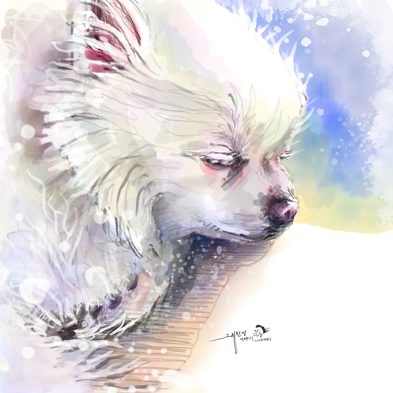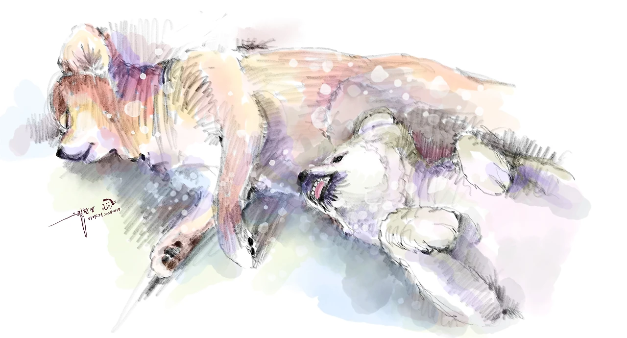 위의 그림에서 좀 더 왼쪽에 널브러져 있는 녀석이 "메이"입니다. 오른쪽 아래에 입 벌리고 있는 녀석이 "모카"이지요. 요즘 메이가 모카를 자주 혼내는 것 같아 걱정이 됩니다. 새 밥을 주고 나서 모카가 밥그릇에 접근하면 메이가 마구 짖어댑니다. 새삼스럽게 지금 와서 서열 정리를 하려는 것인지... 그래도 그림처럼 잠잘 때 저렇게 살을 맞대고 있으니 다행이네요. 모카가 밥을 좀 많이 먹기는 해요. 체중조절을 위한 메이의 훈계인 걸까요?