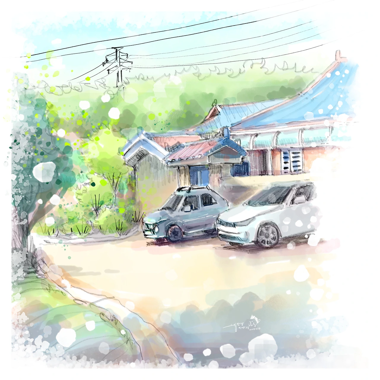 아래 그림은 얼마 전 다녀온 시골집의 풍경입니다. 그사이 집 앞 바닥이 아스팔트로 잘 정비가 되었더군요. 하지만 그림에서는 예전처럼 그렸습니다. 그림 속에서는 예전의 모습이 더 잘 어울릴 것 같더군요. 대문 안의 현관 처마에 제비가 집을 짓고 살고 있었습니다. 제비를 볼 수 있다니 참 소중한 광경이 아닐 수 없더군요. 그런데 제비 덩치가 생각보다 작다는 것을 새삼 알게 되었습니다. 뚱뚱한 비둘기만 보아서 그렇게 느끼는 것일까요?