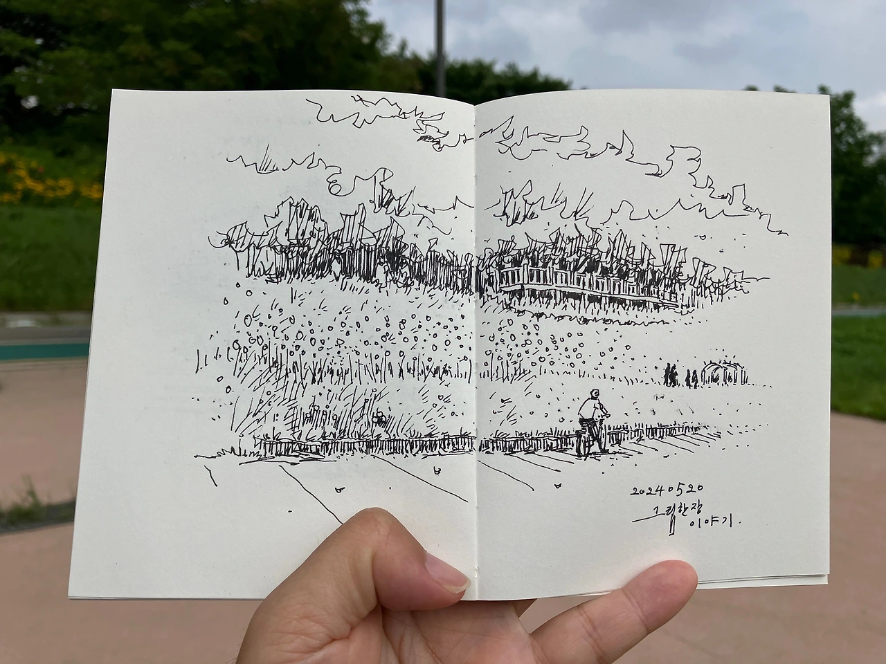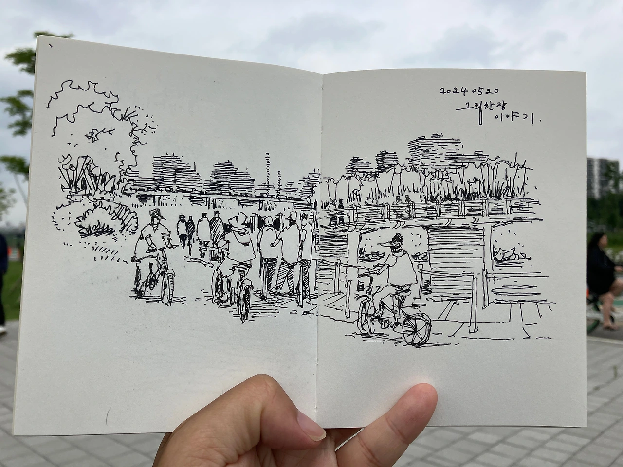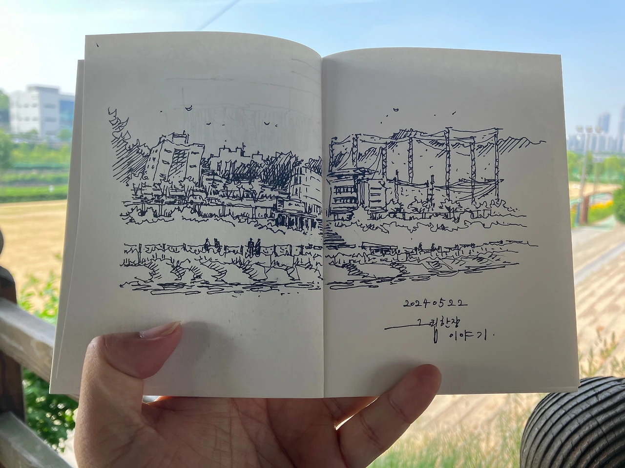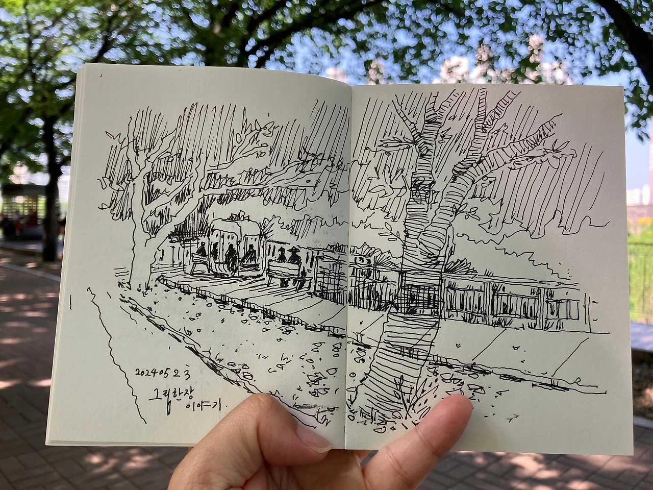 저는 야외 드로잉할 때 아주 밝은 곳에 자리 잡는 것을 선호합니다. 햇빛이 쨍한 곳에서 펜의 선이 선명하게 보이기 때문입니다. 노안이 온 것이죠. 그러나 지금은 생존을 위해 그늘로 피신해 드로잉을 합니다. 뜨거운 햇빛 아래에 오래 머무는 것은 더운 정도가 아니라 위험하기까지 합니다.