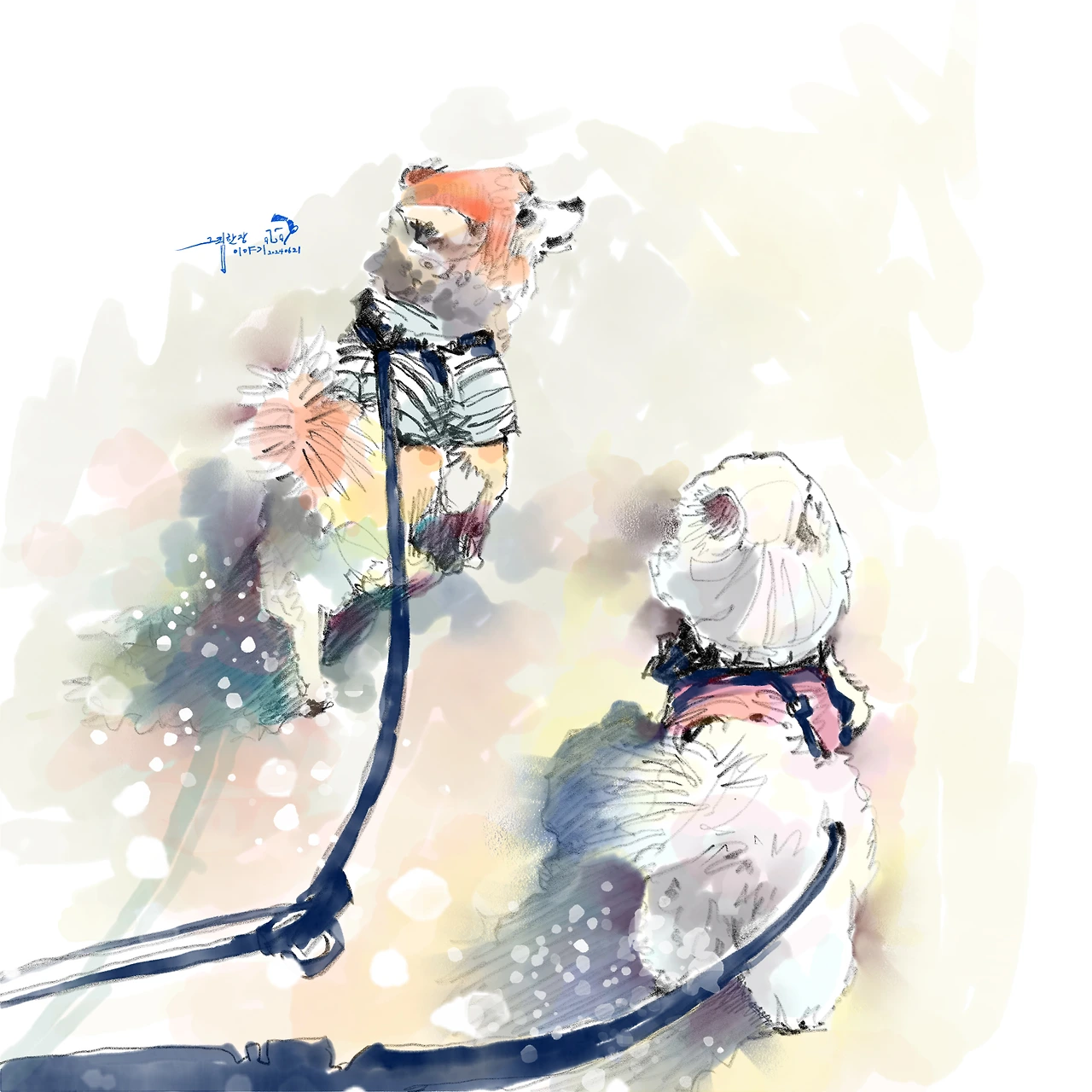 위의 장면은 오랜만에 강아지 두 마리가 동시에 산책을 즐기고 있는 모습니다. "메이"와 "오이"입니다. 영상에서는 경쾌하게 걷는 모습이 신나 보이네요. 하지만 곧 지쳐버립니다. 강아지들도 나이는 못 속이나 봅니다. 걸음이 느려지고 저에게 안아달라고 눈치를 줍니다.