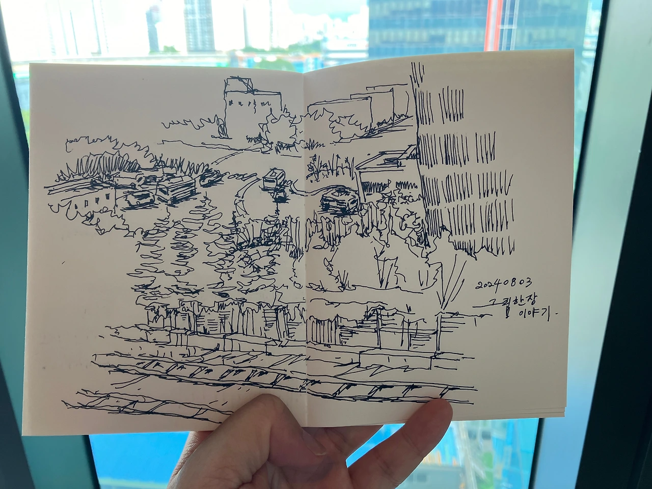 위의 장면은 백화점 고층의 한적한 곳에서 밖을 내다보며 드로잉을 했던 모습입니다. 폭염의 여름날에는 역시 백화점만 한 곳이 없는 것 같습니다. 실내에서 모든 것을 해결할 수 있는 편안함과 시원함은 집에 가는 것도 잊게 만듭니다. 냉방이 얼마나 시원한지 추워서 억지로 집에 가야만 할 정도였습니다.