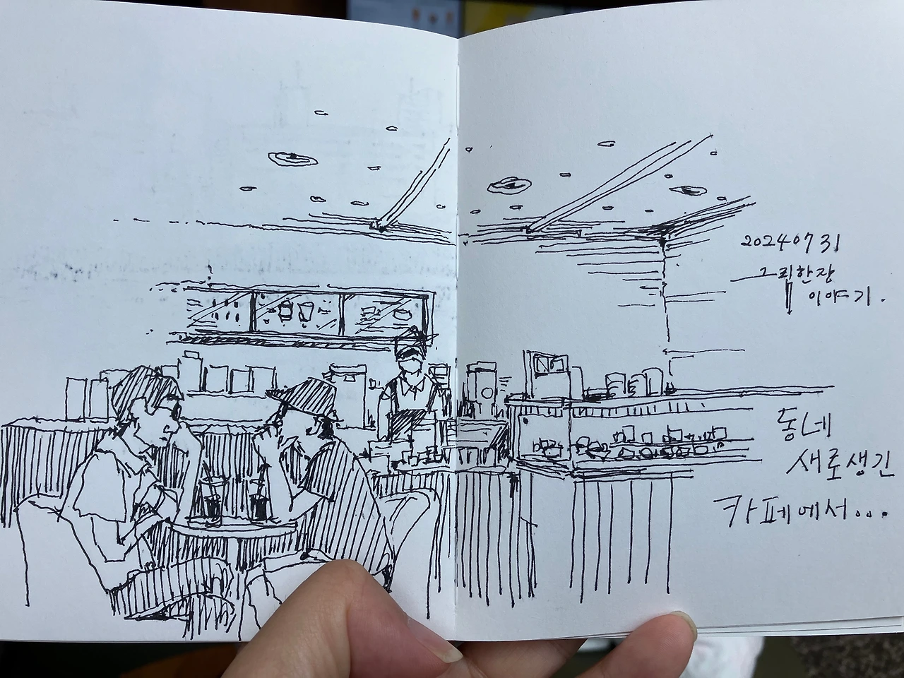위의 장면은 동네에 새로 생긴 카페에서 드로잉을 한 모습입니다. 카페에 사람들이 많아서 촬영이 매우 조심스럽게 이루어졌네요. 새로 생긴 카페라서 그런지 새 건물 냄새가 났는데 불쾌한 종류의 냄새였습니다. 그림을 그리면서 견디기 힘들 정도였습니다.