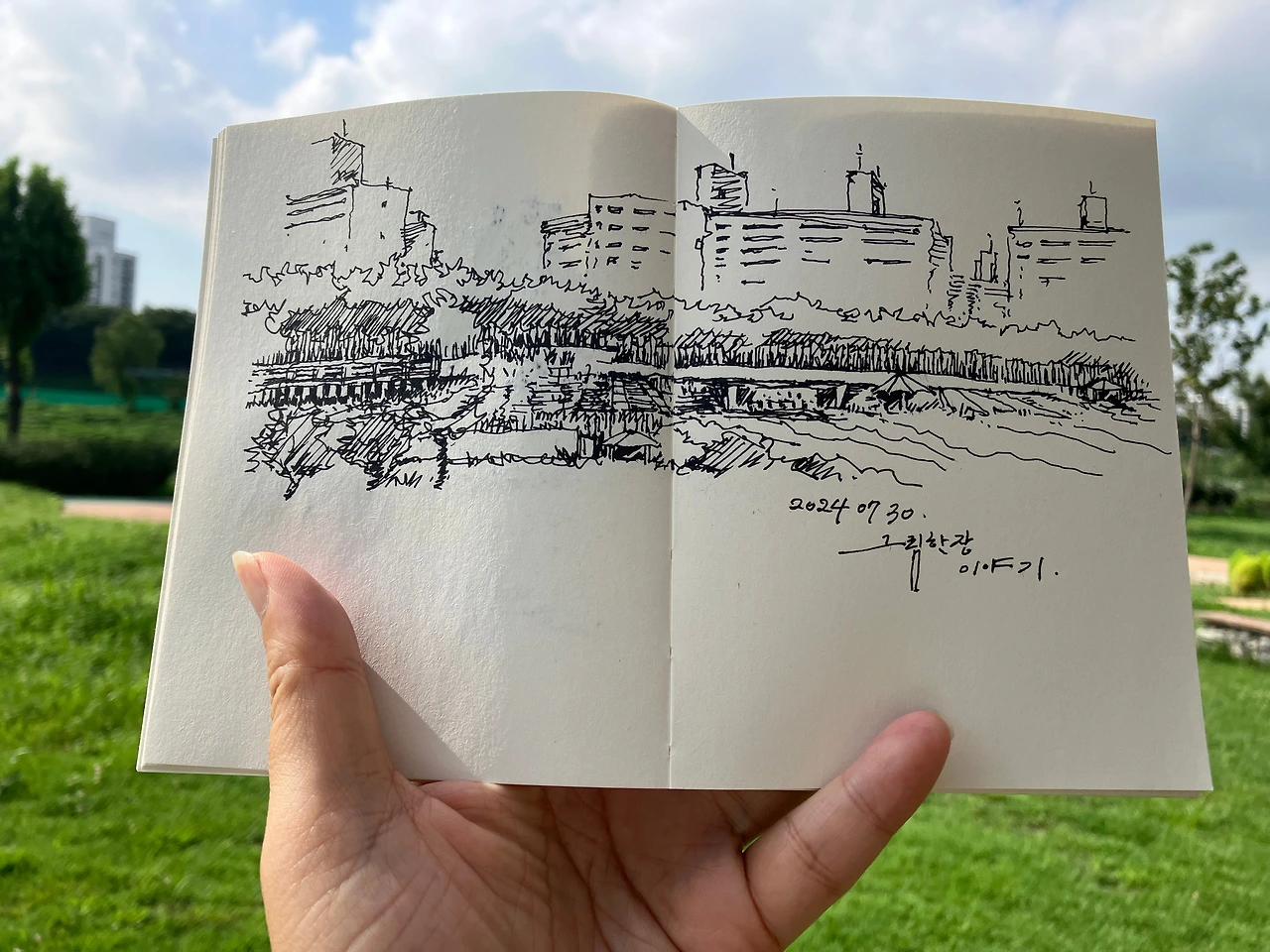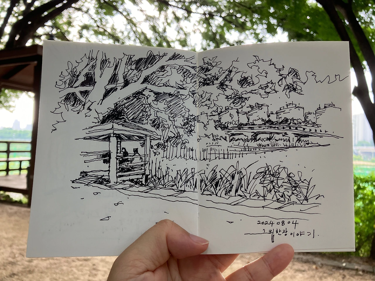 그래도 하늘을 볼 수 있는 야외에서 그림 한 장을 그리는 낭만을 포기하기 쉽지 않네요. 땀으로 옷이 졌고, 오래 머무를 수 없지만 그림을 그리고 있으면 잠시 더위를 잊게 됩니다. 아래 장면들은 "피서"를 하지 못하고 저의 산책길에서 드로잉을 했던 모습입니다.