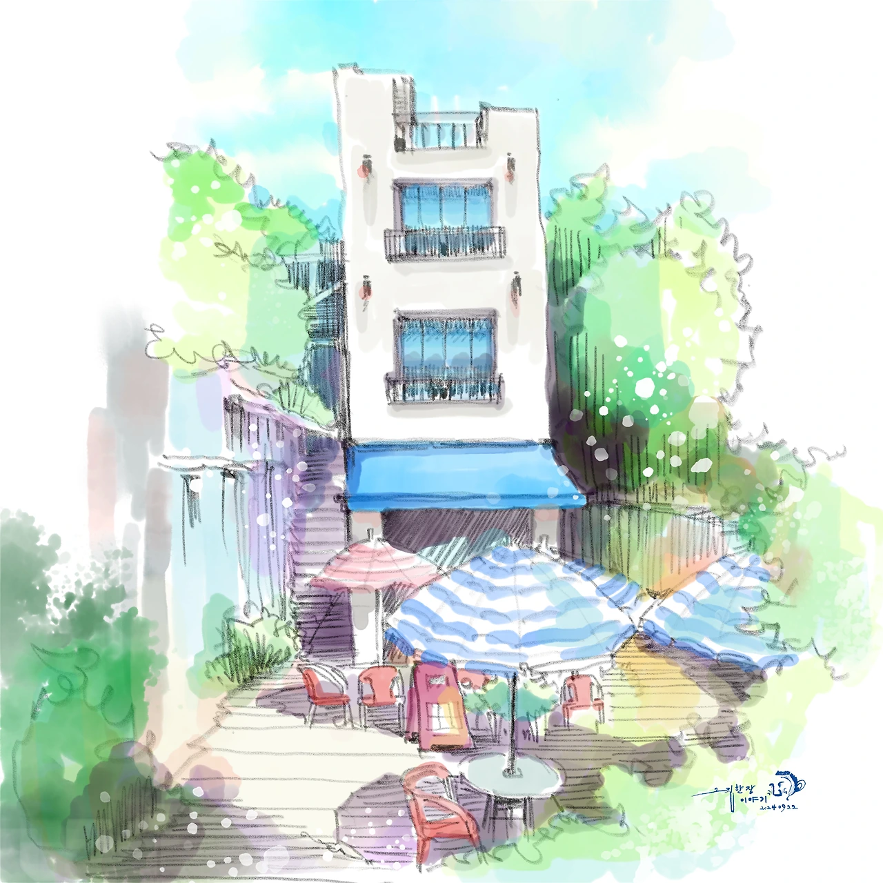 2024년 추석연휴는 폭염이었습니다. 더위를 피할 냉방이 필요했습니다. "블루보틀" 카페에 들어갔습니다. 블루보틀은 항상 사람이 많아서 기다려야 했는데 그날은 한적했습니다. 아이스 아메리카노를 마시며 더위를 식혔습니다. 그리고 현장 드로잉을 했죠. 더위에 실외에서는 드로잉 할 엄두가 안나더군요.