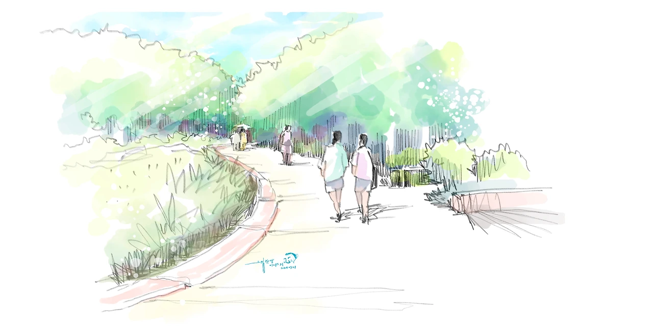 이 여행의 목적지는 "연트럴 파크"라고 불리는 "경의선 숲길"과 "연남동" 나들이입니다. 위의 그림이 바로 경의선 숲길의 모습입니다. 좁고 긴 숲길의 모양이 뉴욕의 센트럴 파크를 닮아 붙여진 별명이죠. 긴 숲길 공원을 따라 카페나 식당, 핫플레스가 많이 위치하고 있습니다. 홍대에서 이어지는 경로에 있어서 즐기기에 최적의 코스입니다. 산책을 좋아하는 저는 그냥 걷는 것만으로도 기분이 좋아졌습니다.