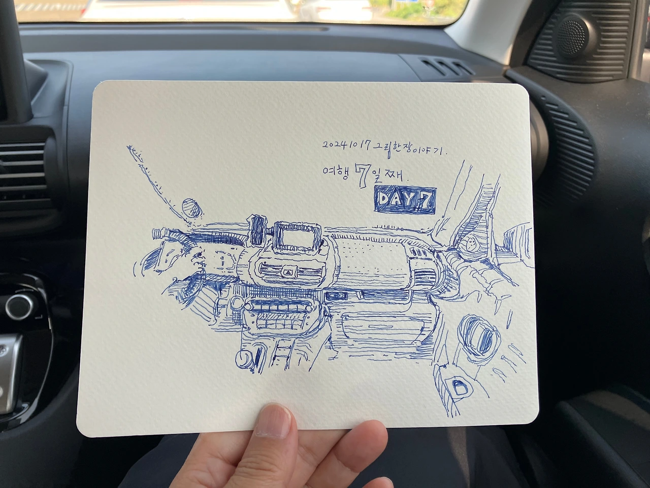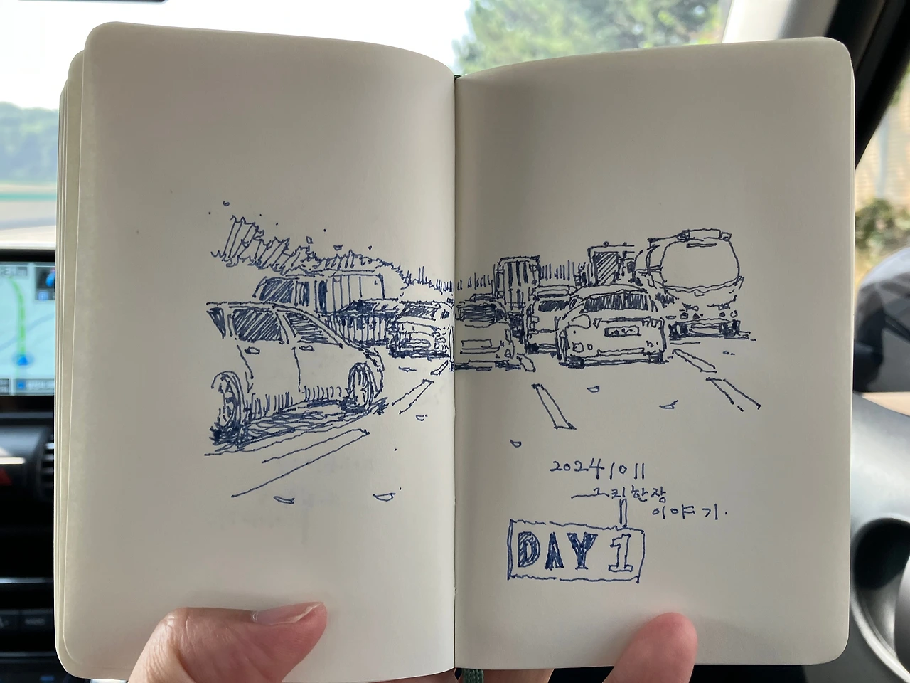 도시에서 시골로 가는 길은 자동차들로 가득한 광경이었습니다. 그 광격을 이번 여행의 첫 풍경으로 그림 속에 담았습니다. 저 자동차들은 어디를 가는 것일까? 이런 낭만적인 생각에 잠길 찰나, 곧 인상이 찌푸려지는 현실에 직면하게 됩니다. "차 간 안전거리 확보는 도대체 왜 안 하는 거지?" 제가 배운 운전 상식에는 시속 50Km로 달릴 때는 50m, 시속 100Km로 달릴 때는 100m 이상 앞차와의 간격을 유지해야 한다는 것이 자리 잡고 있습니다. 요즘은 다른 기준을 사용하나요?