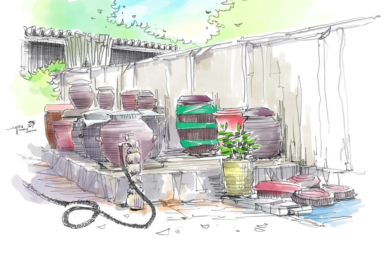 어릴 때 거의 모든 집에는 장독대가 있었습니다. 지금은 보기 힘든 광경이죠. 시골집에는 장독대가 있습니다. 저는 장독대가 보이는 풍경을 좋아합니다. 현장에서 아날로그 그림도 그렸고, 여행이 끝나고 디지털 드로잉으로도 다시 그 풍경을 그려보았습니다.