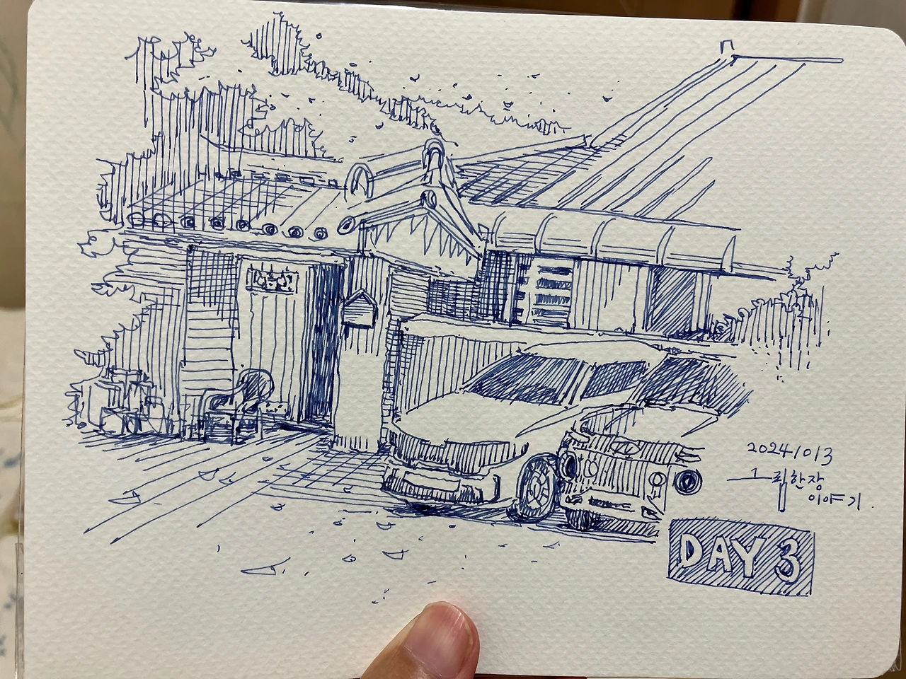아는 사람들이 모여있을 때 저는 철저히 "그림 그리는 사람"이란 정체성을 숨깁니다. 가족 친척분들이 떠나고 한적한 시골 풍경을 마주하게 되었습니다. 혼자 몰래, 종이를 꺼내서 그림을 그려봅니다.