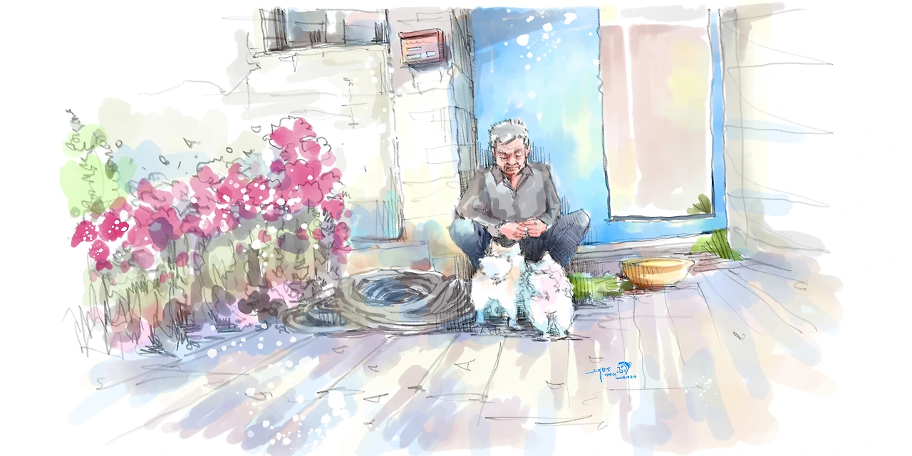 위의 그림은 할아버지에게 다가가는 우리 강아지들입니다. "모카"와 "오이"가 그새 할아버지와 친해졌네요. 시골 츤데레 할아버지는 무심하듯 강아지들에게 간식을 줍니다. 너무 많이 줘서 우리 강아지들은 살이 너무 쪘습니다. "메이", "모카", "오이" ~ 이제 다이어트하자.