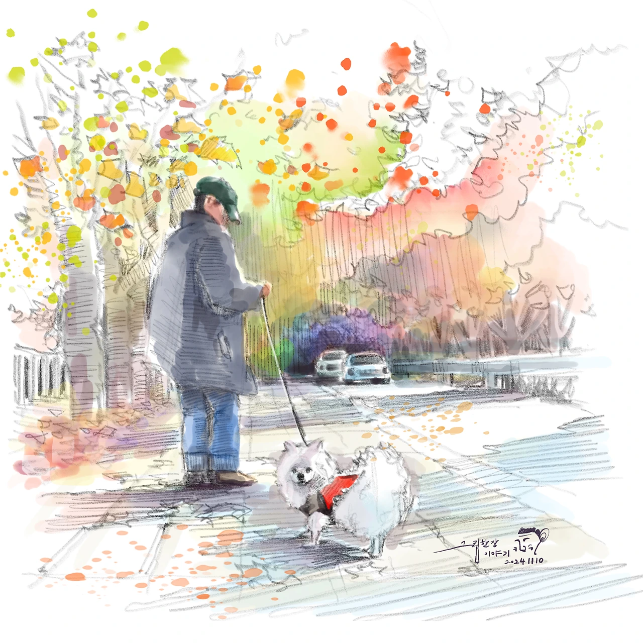 위의 장면은 동네 멋진 단풍길을 산책했던 모습입니다. "오이"와 함께했죠. 오이가 바라보고 있던 곳에는 아내가 서있었습니다. 오이는 아내를 더 좋아합니다. 아내와 거리가 멀어지니 오이가 당황하네요.