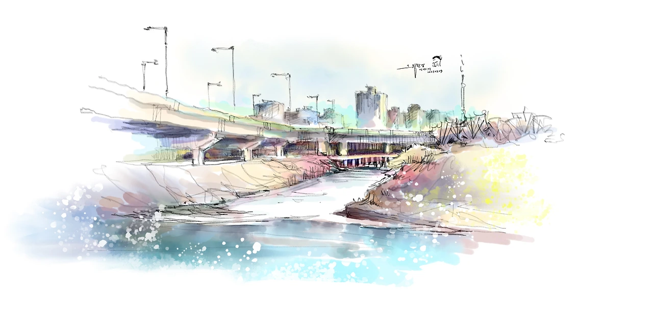 위의 장면은 그 아름다운 장면을 드로잉 한 모습입니다. 적당히 앉을만한 곳을 찾다 보니 구도가 좀 달라졌네요. 생각대로 맨손으로 드로잉 하기에는 손이 시렸습니다. 몸을 움직이지 않고 가만히 있으니 한기도 느껴졌습니다. 급하게 마무리를 하고 자리를 일어났죠. 걷거나 가벼운 운동을 하기에는 괜찮아 보여도 야외 드로잉을 하기에는 아직 차가운 날씨였습니다.
