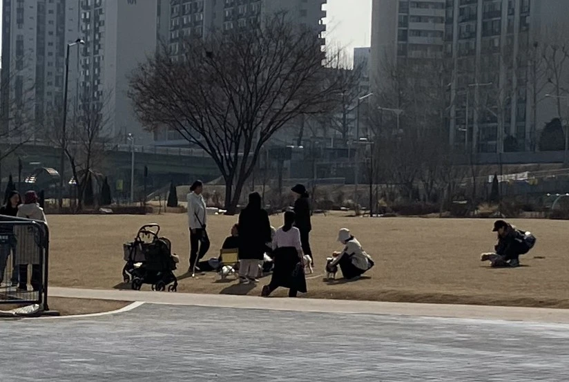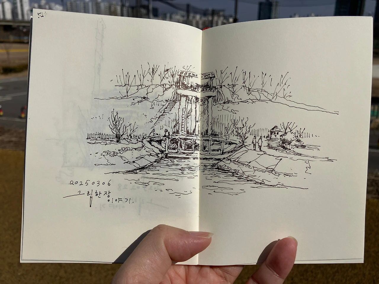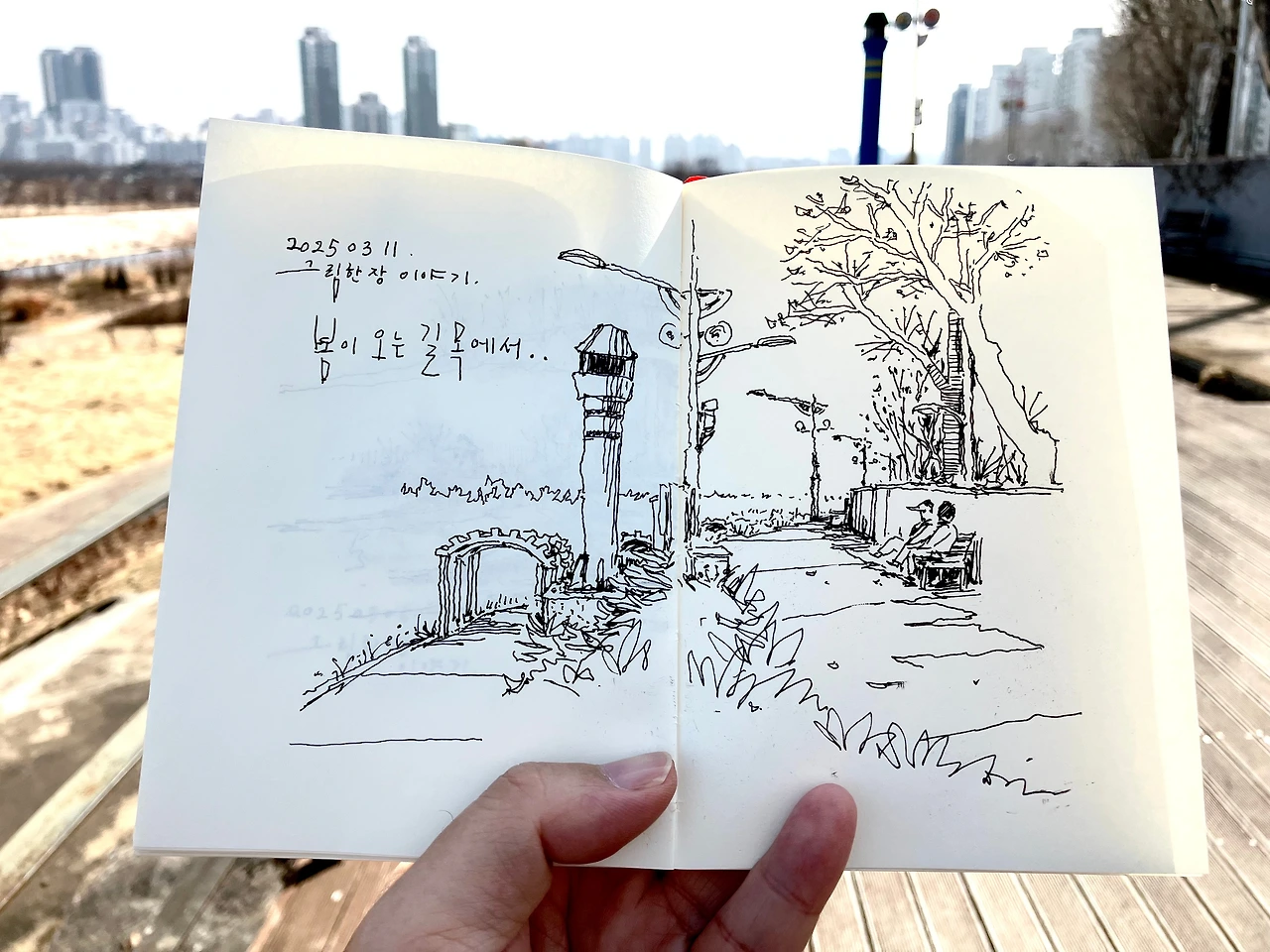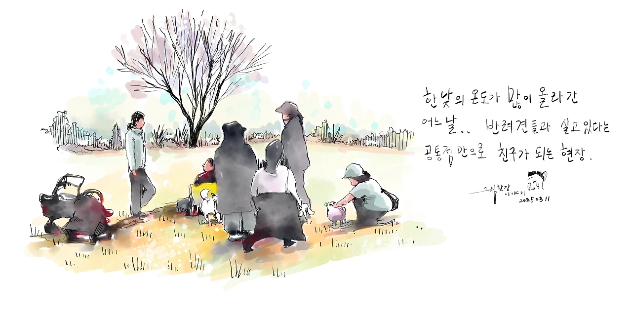 현장 드로잉은 아니지만 그림으로 남긴 산책길 모습을 추가합니다. 날이 따뜻해서 반려견을 동반해 산책하는 사람들이 많았습니다. 반려견과 함께 산다는 공통점만으로도 처음 본 사람들이 친구가 됩니다.
