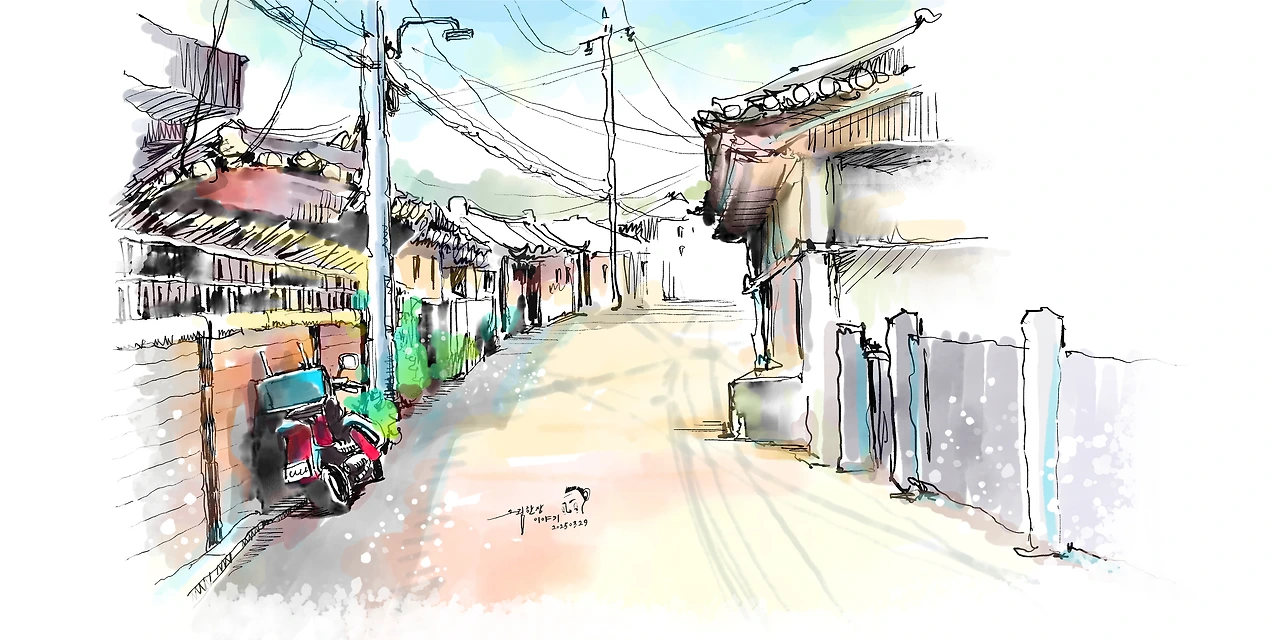 노면 전철이 다니는 이국적인 풍경도 좋지만 익숙한 골목 풍경이 주는 포근함도 포기할 수 없습니다. 누군가가 찍은 골목 풍경이 저의 그림 속에 담겼습니다. 오래된 한옥 주택이 즐비한 골목의 모습입니다. 벽에 세워진 오토바이가 눈에 들어오네요. 배달을 곧 나갈 것 같은 분위기입니다. 전봇대와 복잡한 전선들의 모습들이 분위기를 한층 고조시키고 있네요. 잠시 머물고 싶은 골목입니다.