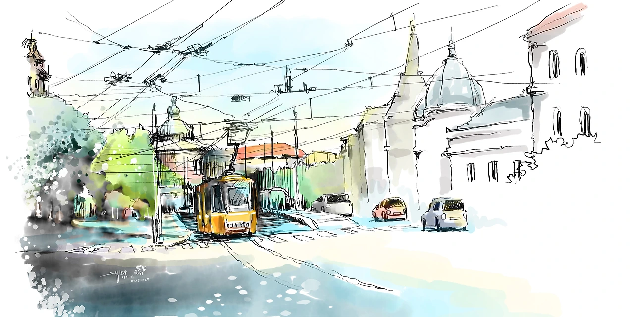 노면 전철이 다니는 풍경은 많은 그림쟁이들이 그려보는 인기 풍경일 것 같습니다. 대한민국에서 보기 드문 장면이기도 하고, 왠지 모를 낭만이 묻어있기 때문이죠.