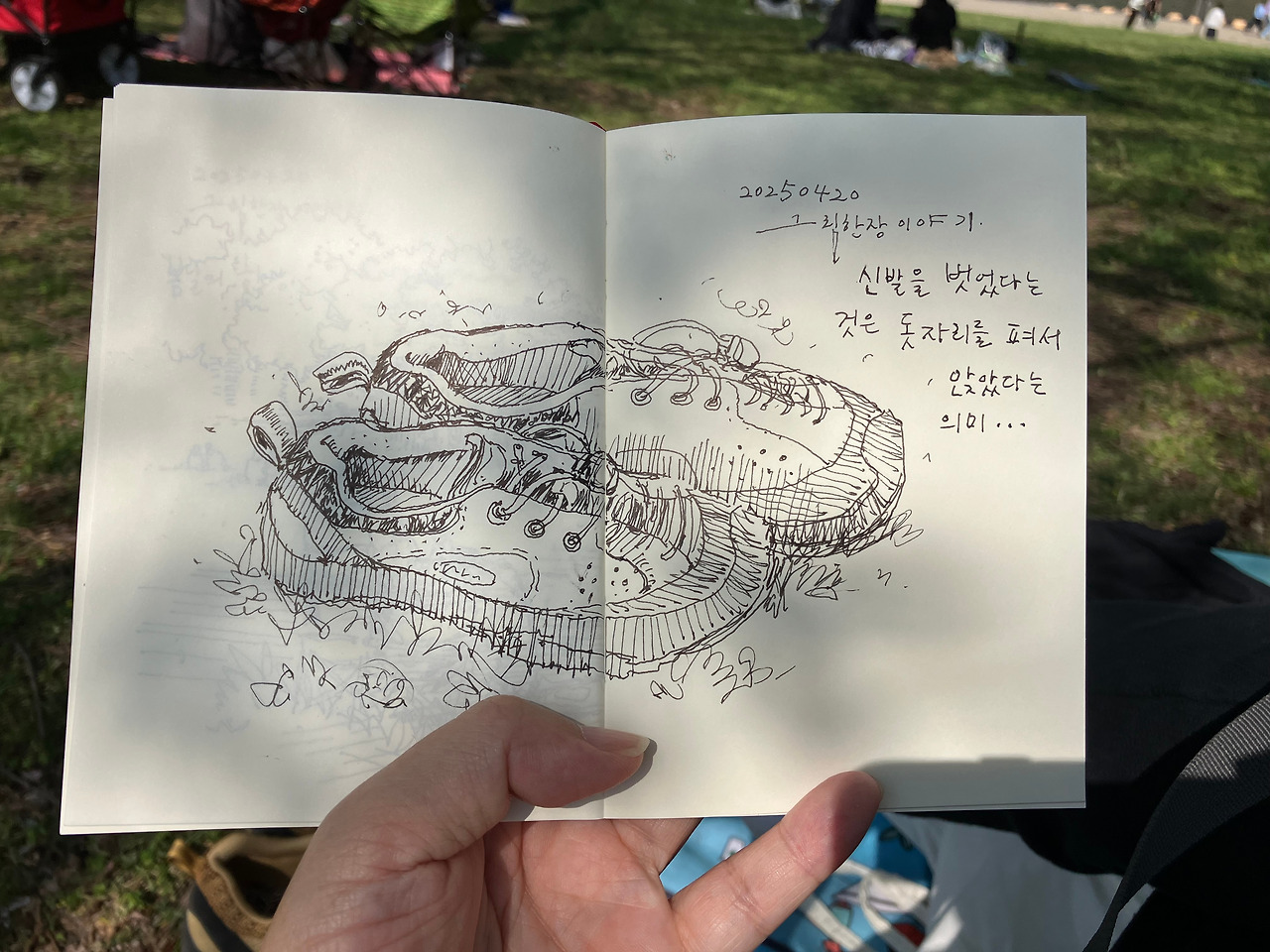한강 공원, 자주 가는 우리만의 자리에 작은 돗자리를 폅니다. 한강 나들이를 위해 구입한 작은 캠핑 의자 두 개를 조립합니다. 그리고 신발을 벗고 편하게 자리를 잡습니다. 집 밖에서 신발을 벗었다는 것은 저에게 이런 의미입니다. 살랑거리는 바람을 맞으며 돗자리 위에서 한가한 한때를 보내는 것 말이죠.