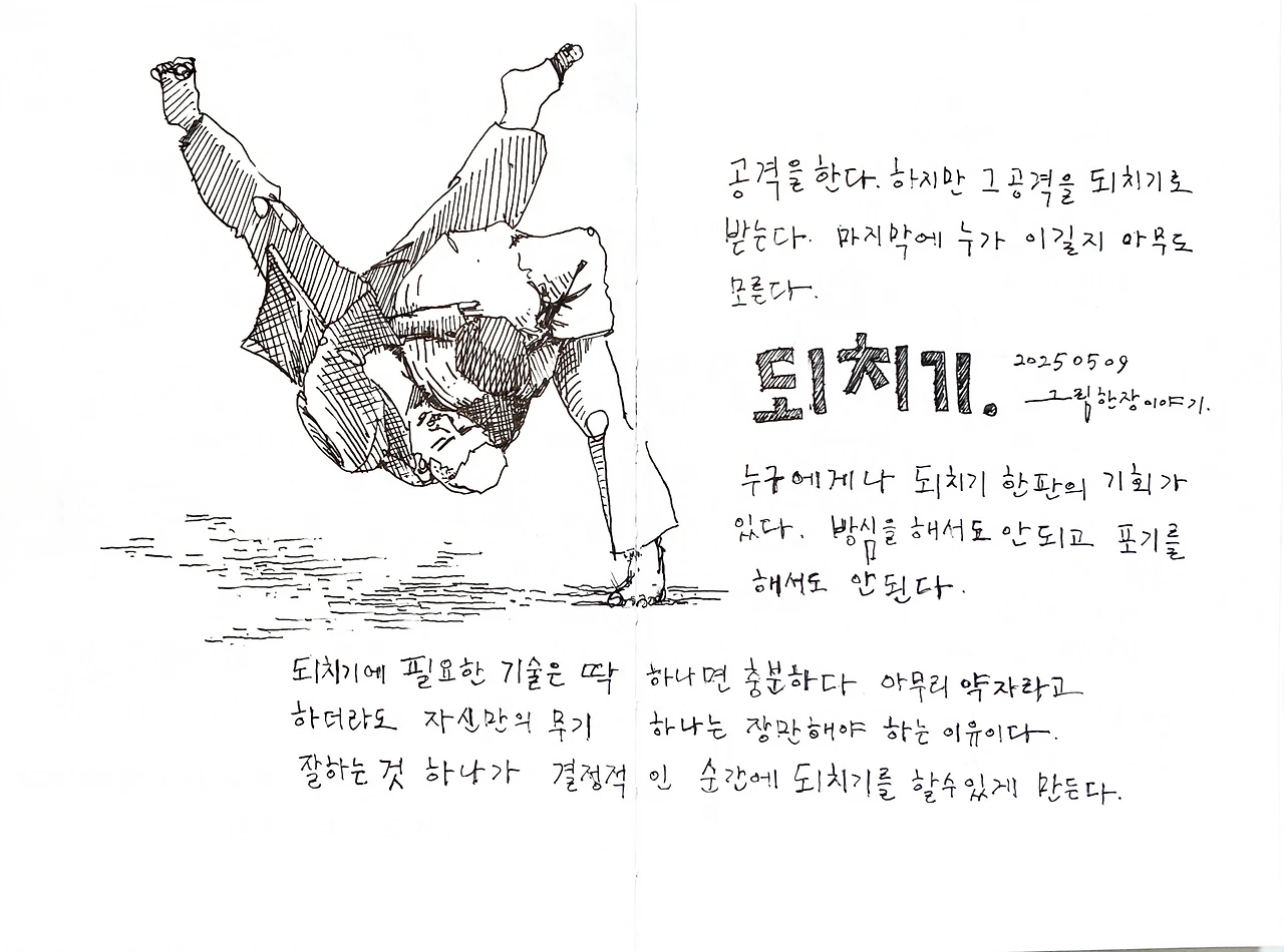 사람들은 되치기로 이긴 그 선수를 운이 좋다고 말합니다. 사람들은 모르죠. 그가 강자를 이기기 위해 한 가지 기술을 밤새도록 연마했다는 것을요. 되치기에 필요한 것은 딱 한 가지의 기술뿐입니다. 그 기술의 종류는 상관없습니다. 무엇이든 자신이 잘하는 것 하나를 갈고닦는 것이죠. 그리고 가장 중요한 조건이 남아있습니다. 경기가 끝날 때까지 상대방에게 한판패를 당하지 않는 것입니다. 무슨 짓을 하더라도 경기 중에 게임이 끝나는 것을 막아야 합니다. 되치기의 기회는 반드시 오기 때문입니다.