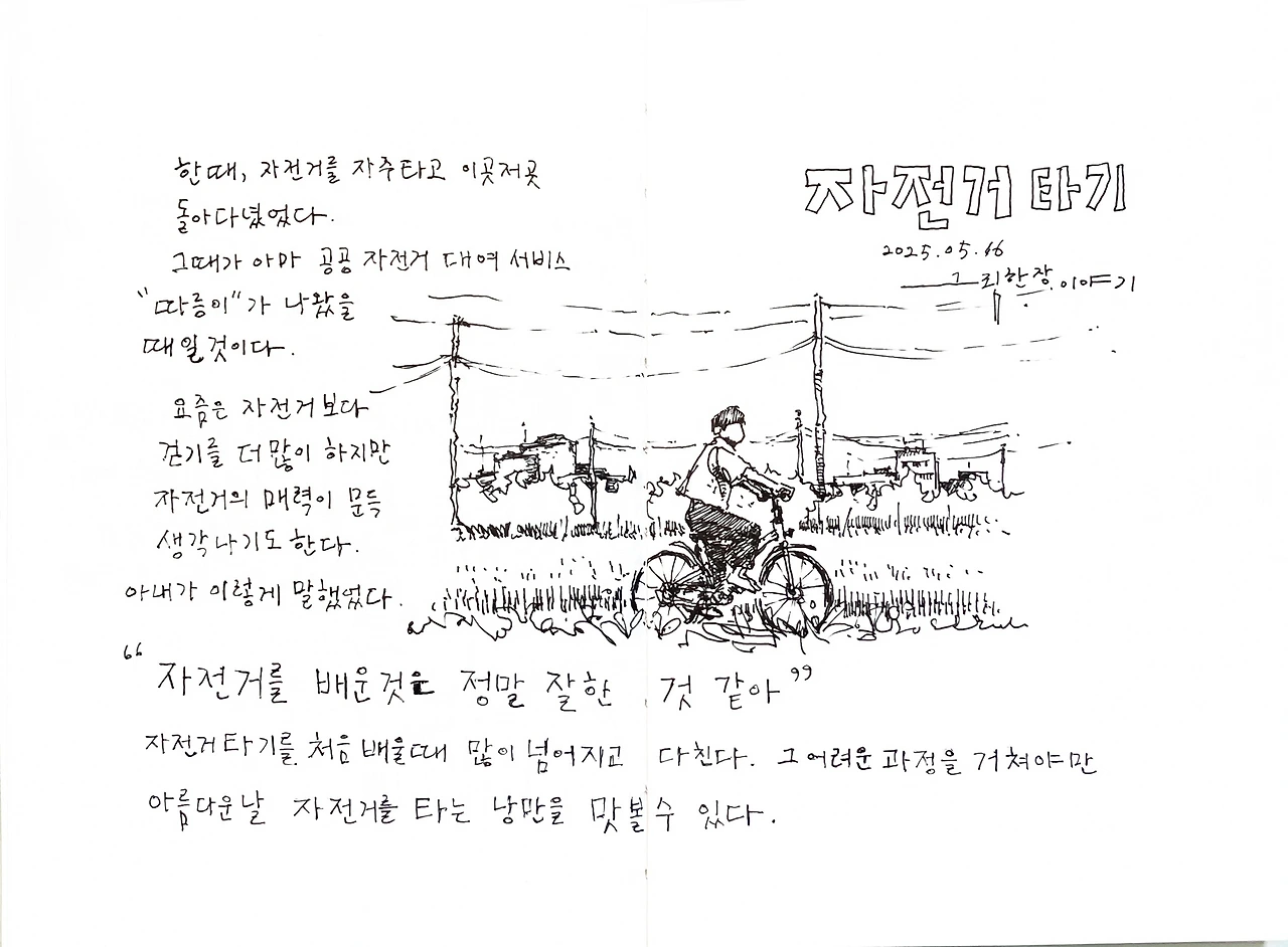 한때, 공공 자전거 대여 서비스 "따릉이"를 이용해 이곳저곳 돌아다녔습니다. 지금은 산책을 더 선호하지만 자전거 타기는 언제나 다시 해보고 싶은 여가 활동입니다. 어릴 때 자전거 타는 법을 익혀둔 것이 정말 다행이라고 생각합니다.