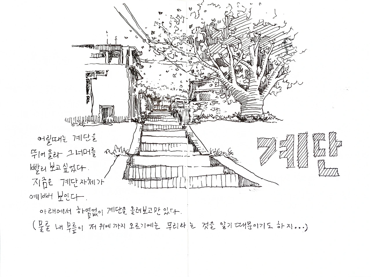 어릴 때는 보이지 않던, 하늘을 향해 뻗어있는 계단의 아름다움을 발견한 것입니다. 계단 아래에 있어야만 볼 수 있는 풍경이죠. 물론 계단을 오르기에 이제 저의 무릎이 견디지 못합니다. 운동하기 싫어하는 저의 게으름이 핑계를 찾은 것인지도 모르겠네요.