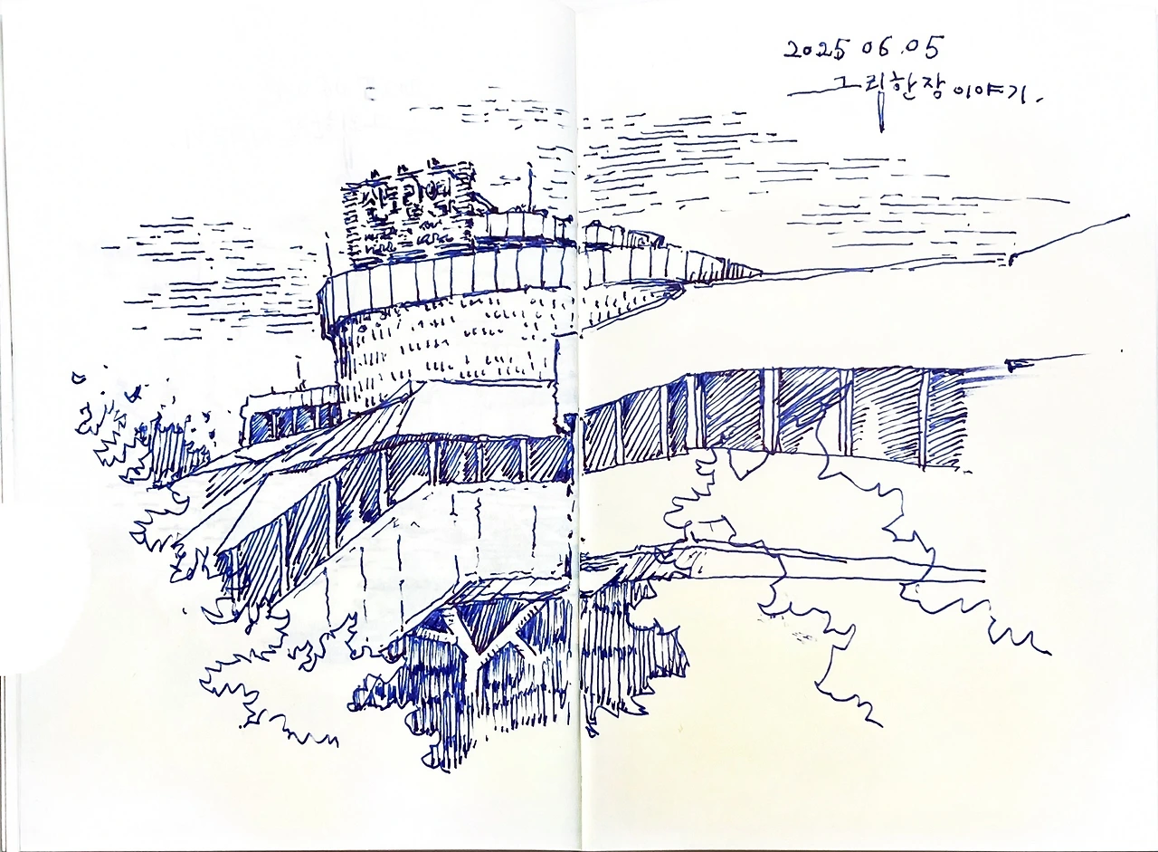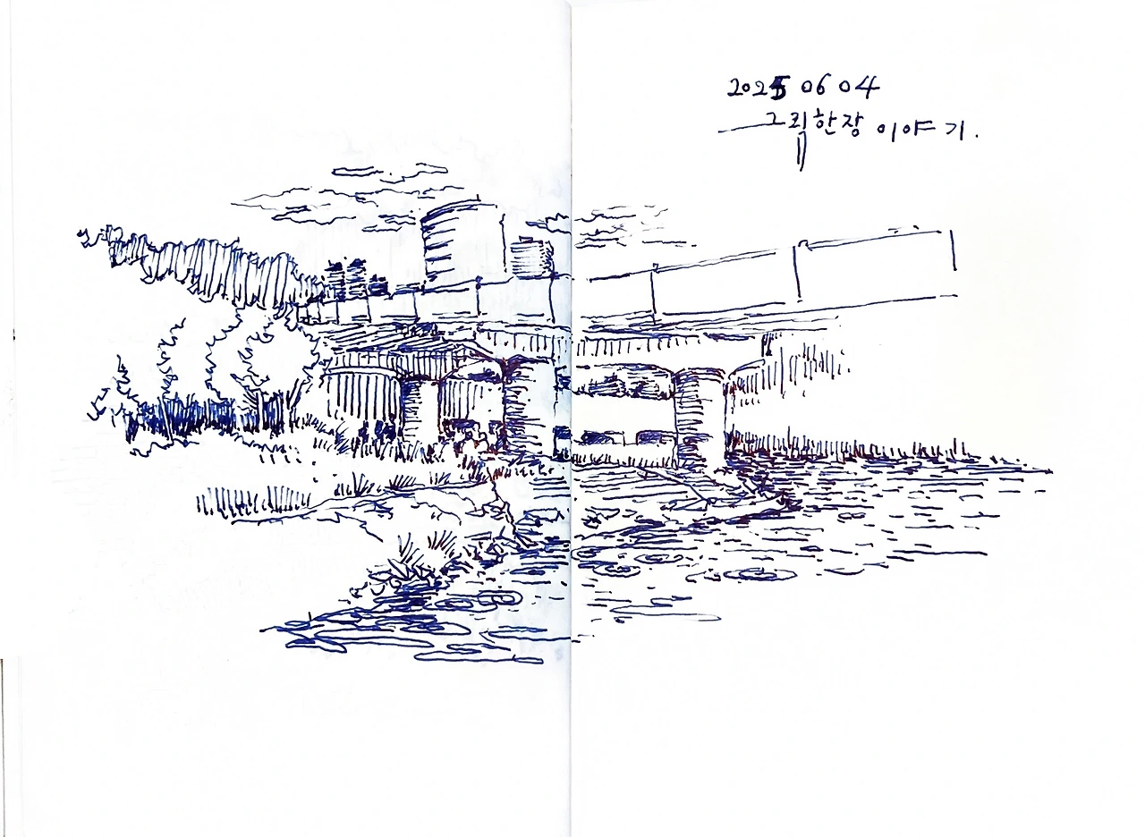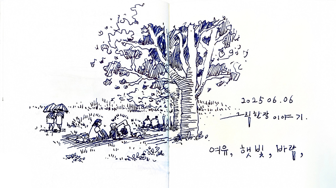 위의 장면은 2025년 6월 6일의 모습입니다. 그날도 일상의 아름다움을 온몸으로 만끽하며 그림을 그렸습니다. 이런 평화로운 일상을 보장받지 못한다면 어떨까? 생각만 해도 끔찍했습니다. 일상을 그림으로 옮기기 전에는 지금 이 순간이 평화롭다는 인식을 하지 못했습니다.