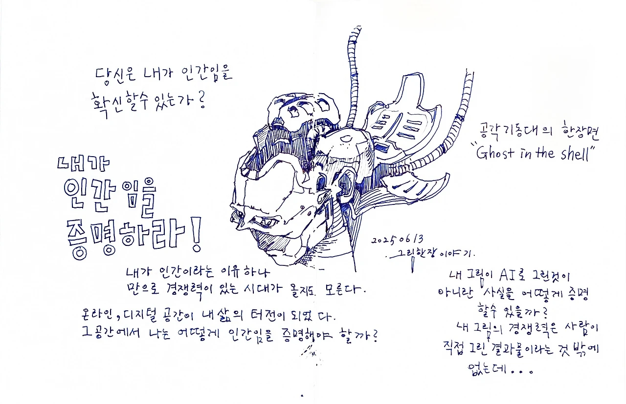저의 그림을 AI가 만든 그림들과 함께 마켓에 올렸다고 생각해 보죠. 사람이 그린 그림을 찾는 소비자들은 내가 AI가 아니라는 것을 어떻게 확신할 수 있을까요? "저는 인간입니다."라는 말을 믿을까요? 마켓에서 준비한 인간 작가 인증 시스템만 믿으면 될까요?
