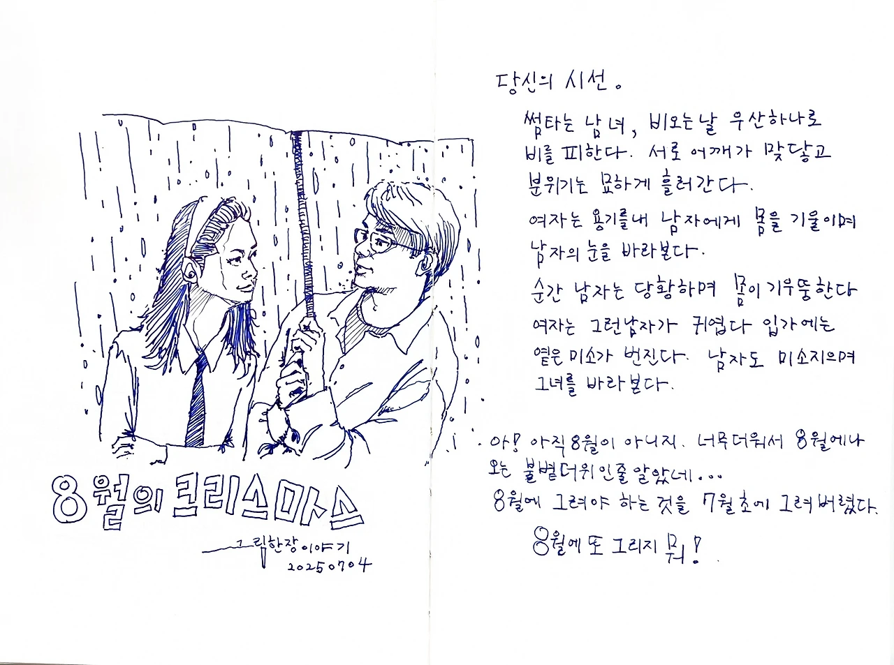 뭔가에 홀려 그리다가 정신을 차려보니 영화 "8월의 크리스마스"의 장면이었습니다. 기억나는 것은 그림을 그리는 순간 너무 더웠다는 것입니다.
