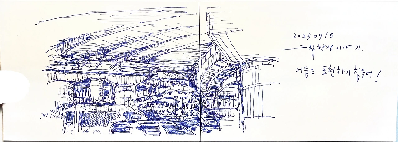 야외 드로잉을 할 때 저는 햇빛이 밝은 곳을 선호합니다. 명암의 대비를 극적으로 보여주기도 하지만 저의 시력이 예전만 못하기 때문이죠. 이제 광량이 많은 곳이 아니면 눈이 침침합니다. 그늘이 없는 햇빛 밝은 곳에서 드로잉을 하기 위해서는 가을의 선선함 만큼 좋은 게 없습니다.