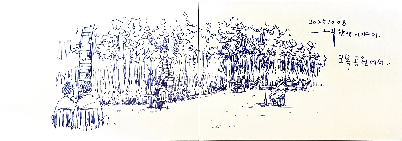 비가 멈추고 잠시 해가 나면 주변 공원에 가기도 했습니다. 자주 가는 산책로에서 벗어나 조금은 생소한 공원에서 그림 한 장을 그렸습니다.