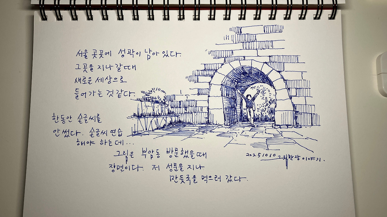 키보드만 두들기다가 어느 순간 펜을 잡았을 때의 감촉, 굳은살을 건드리는 펜의 존재감, 학생시절 칠판 가득 채운 내용을 필기하던 고통이 다시 살아나는 듯 해 불쾌하지만 몸에 새겨진 훈장 같아 뿌듯하기도 합니다.