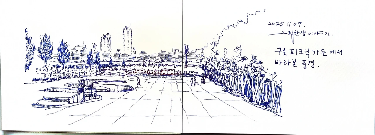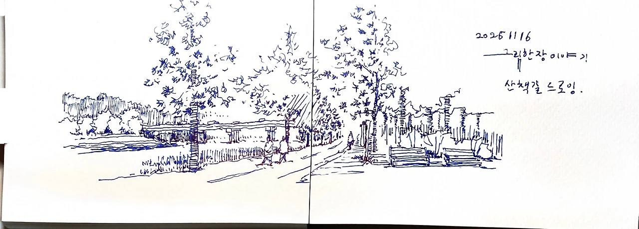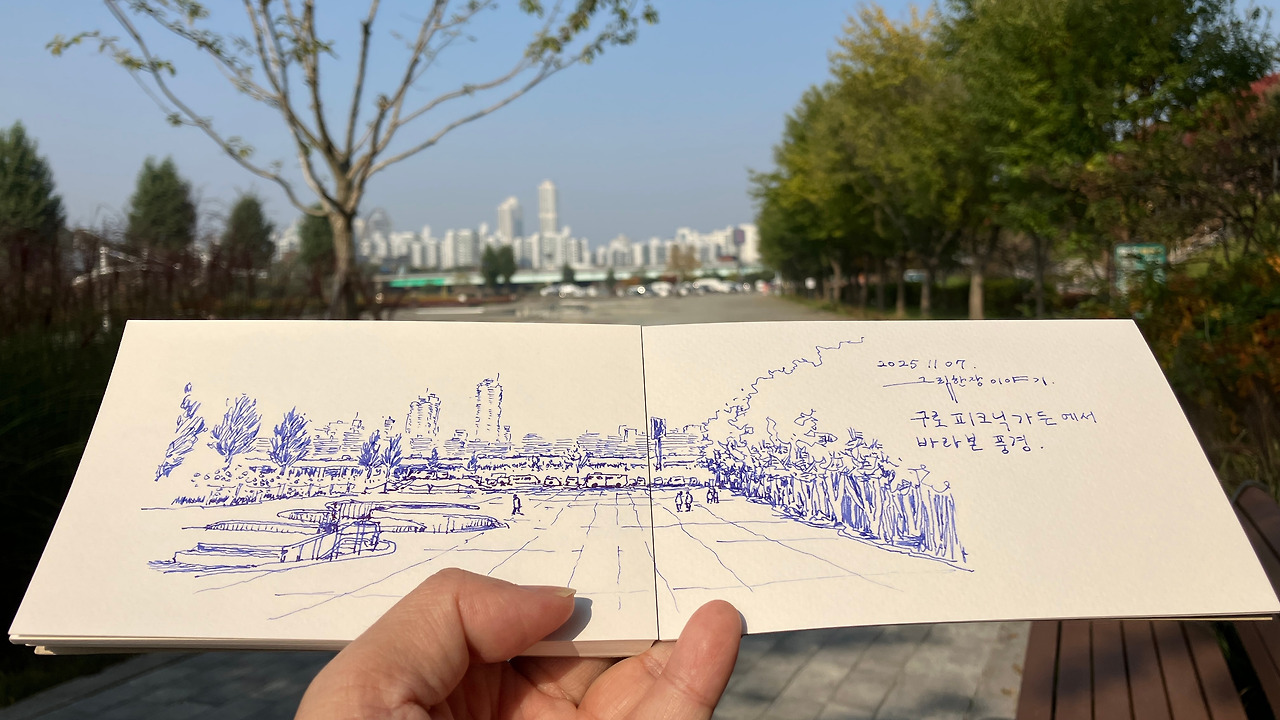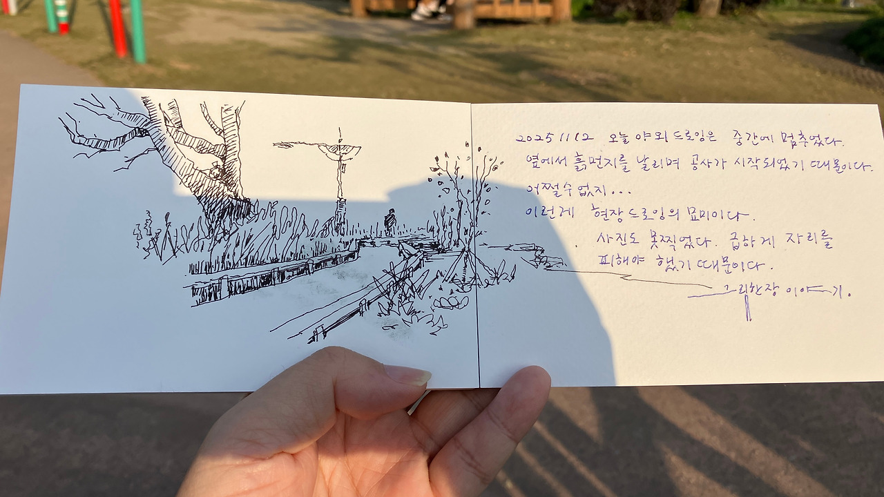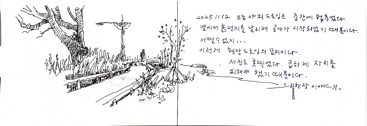 위의 장면은 드로잉 하다가 갑자기 주변에서 공사를 하는 바람에 마무리하지 못한 상황입니다. 먼지가 날리고 매캐한 냄새까지 피어올라 그 위치에 머무를 수가 없었습니다. 그곳에서의 드로잉은 미완성으로 끝내고 멀리 떨어진 장소로 도망갔습니다.