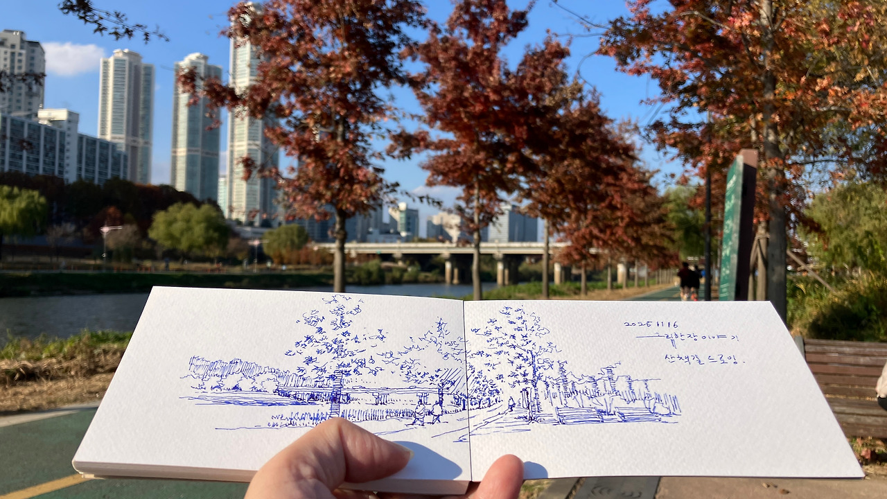 현장에서 야외 드로잉을 하다 보면 생각하지 못한 일들이 발생하곤 합니다. 바로 몇 분 뒤, 몇 초 뒤의 상황도 예측할 수 없죠. 처음 야외드로잉을 시작하고 한동안 그런 상황들이 저를 매우 불안하게 만들었습니다. 그림 그리기에 절대 도움이 안 되는 요소라고 생각했죠. 이제야 비로소 알 수 없는 미래가 얼마나 신나는 일인지 조금 감이 오게 되었습니다.