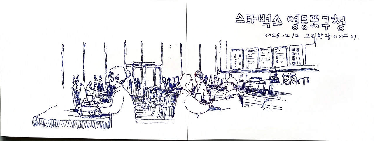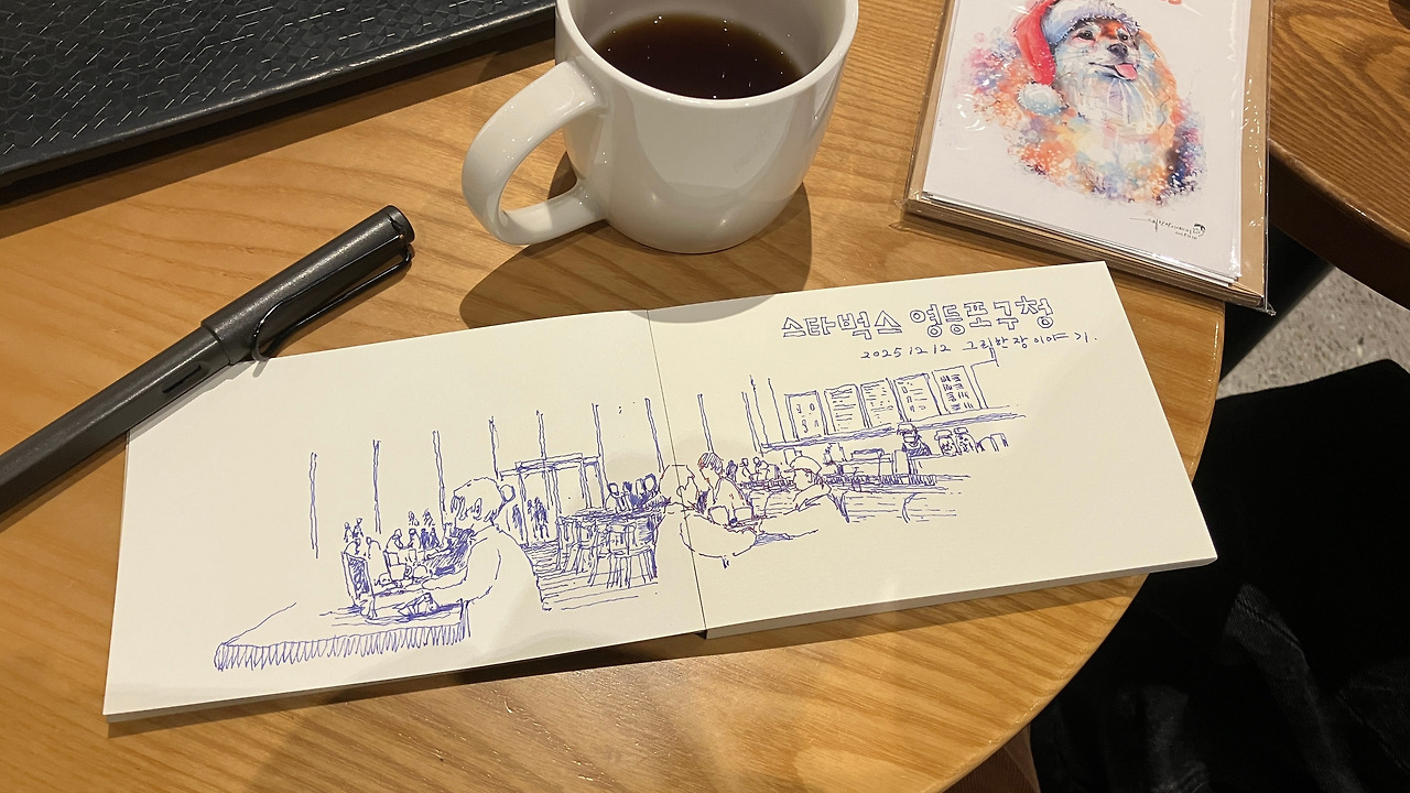 오랜만에 집 밖에서 드로잉을 했습니다. 한 동안 쉬었던 [일상을 여행으로 만드는 그림]을 하게 되니 다시 설레는 기분입니다. 이 설레는 기분으로 매일 나가서 드로잉을 하고 싶지만 감기를 더 조심해야 하는 나이가 되었다는 사실에 서글퍼집니다. 추워서 야외 드로잉은 힘들겠지만 이번처럼 카페 안에서라도 드로잉을 적극 시도해봐야 하겠습니다.