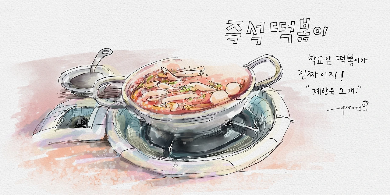 아내는 즉석 떡볶이를 좋아합니다. 학생시절 학교 앞에서 사 먹던 즉석 떡볶이의 맛을 잊을 수 없다고 합니다. 언젠가 아내와 함께 그 추억의 장소에 방문했었는데 즉석 떡볶이 집은 찾아볼 수 없더군요. 위의 그림과 사진은 동네 여고 근처의 유명한 즉석 떡볶이의 모습입니다.