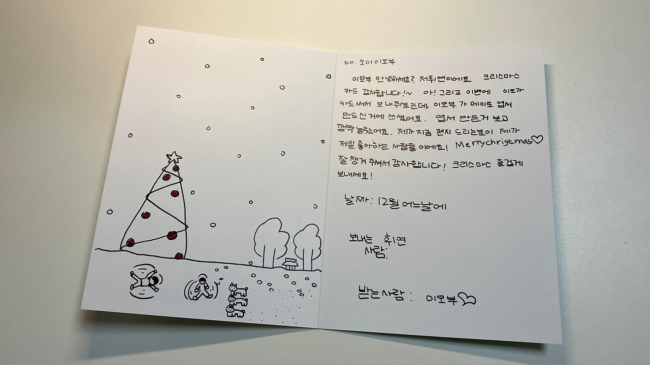 2025년 12월 25일, 크리스마스 카드를 받았습니다. 제 주위에는 크리스마스 카드를 받은 사람들이 별로 없더군요. 얼마나 자랑하고 싶은지... 딱 한 명한테만 받은 카드이지만 그 어떤 크리스마스 선물보다 값지고 소중했습니다.