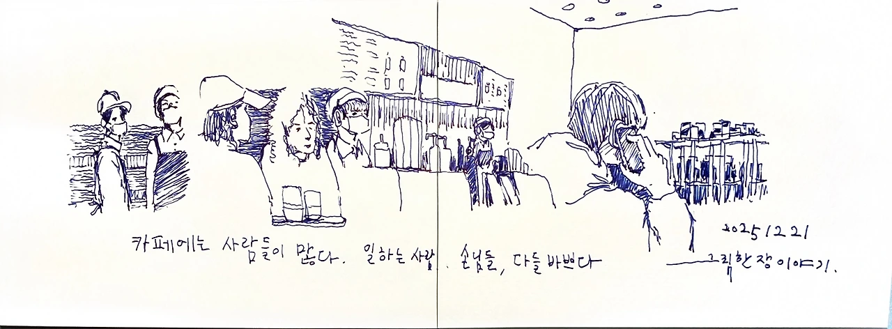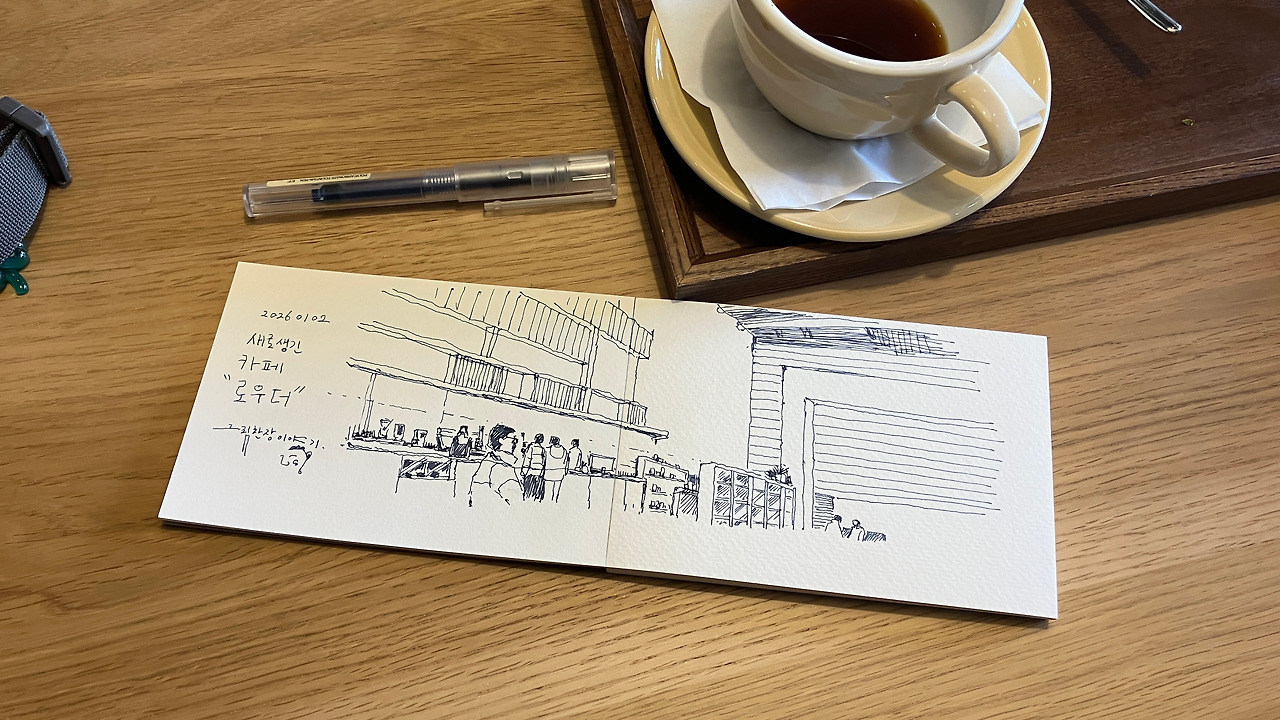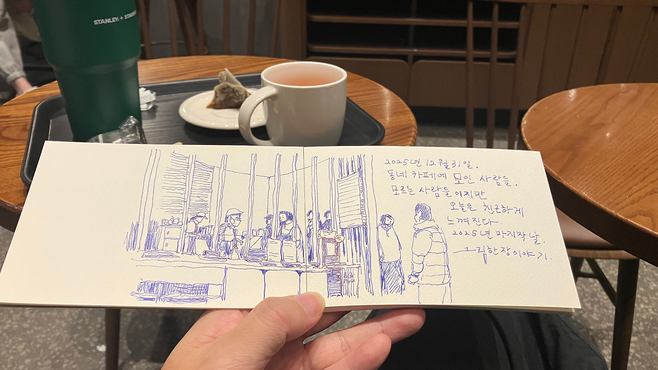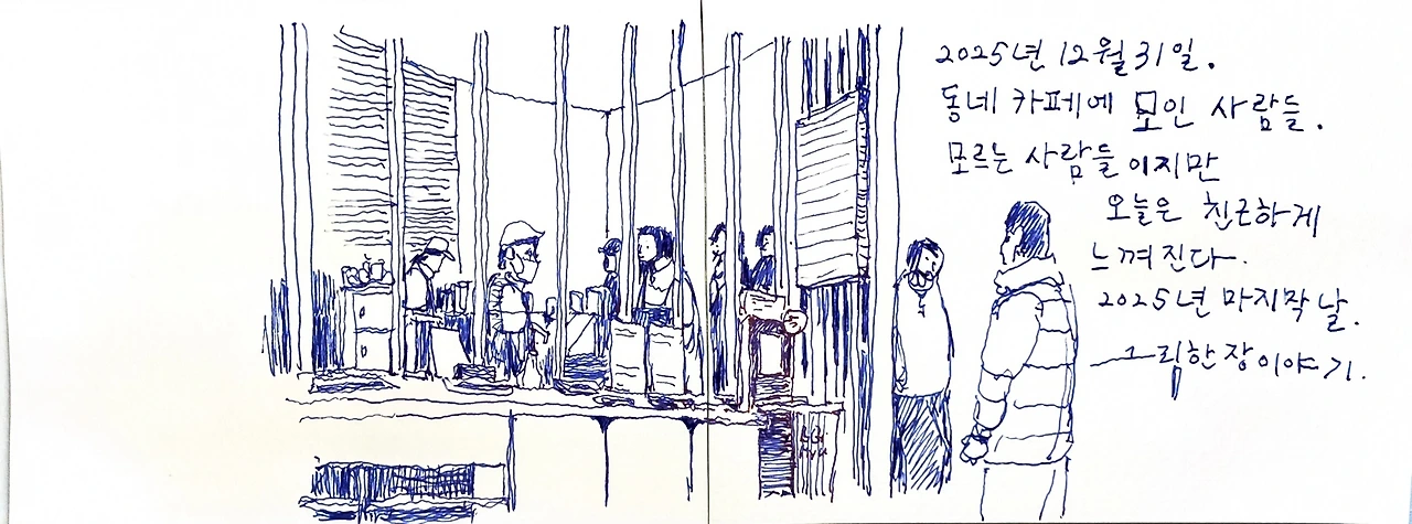 2025년 12월 31일, 한해의 마지막을 [일상을 여행으로 만드는 그림]을 그리며 보냈습니다. 31일 저녁 시간, 동네 카페에 의외로 사람들이 많이 있더군요. 여느 일상을 보내듯이 동네 주민들로 보이는 사람들이 많이 나와있었습니다. 한해의 마지막날 그 풍경을 그리고 있는 사람은 아마도 저밖에 없었을 것 같네요.