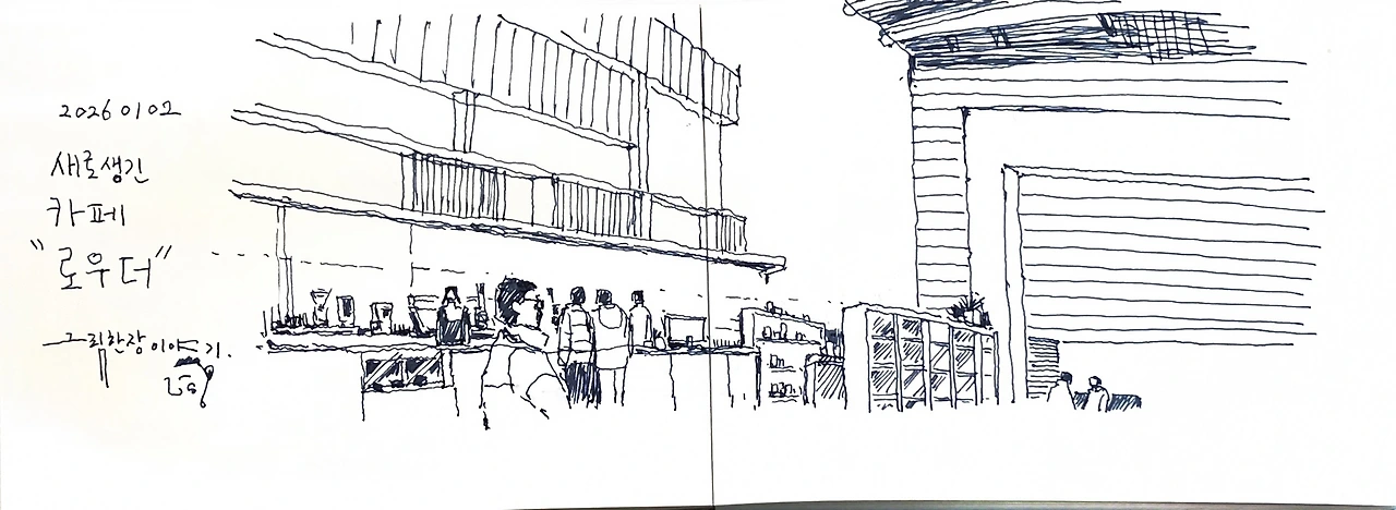 2026년 1월 2일, 새로운 해의 첫 [일상을 여행으로 만드는 그림]을 그렸습니다. 동네에서 좀 떨어진 신상 카페에 방문했습니다. 층고가 높고 넓어서 좋았지만 매우 추웠습니다. 이날 칼바람이 부는 추운 날씨였는데, 층고가 높은 장소의 난방은 어렵다는 사실을 몸으로 직접 체험했네요. 날씨가 따뜻해지면 쉬어가기 좋은 곳이 될 것 같습니다.
