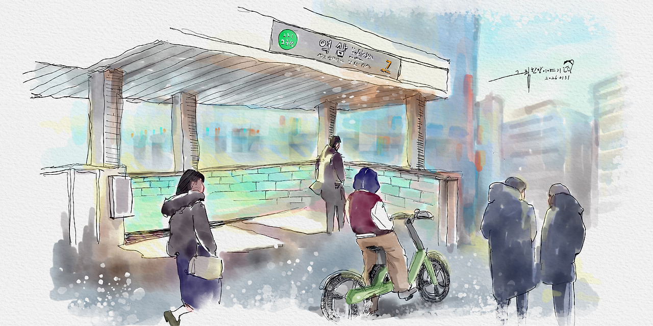 오랜만에 강남에 가보는군요. 이번 [그림 속 작은 여행]은 역삼역에서 시작합니다. 역삼역 출구에서 보이는 풍경은, 이곳이 서울에서 잘 나가는 오피스 지역임을 단번에 느낄 수 있게 합니다. 방문한 날이 평일 점심때쯤이라서 식사를 하려는 직장인들로 길이 가득 찼습니다. 저희 첫 일정이 점심을 먹는 것이었기에 발길을 빨리 옮겼습니다.