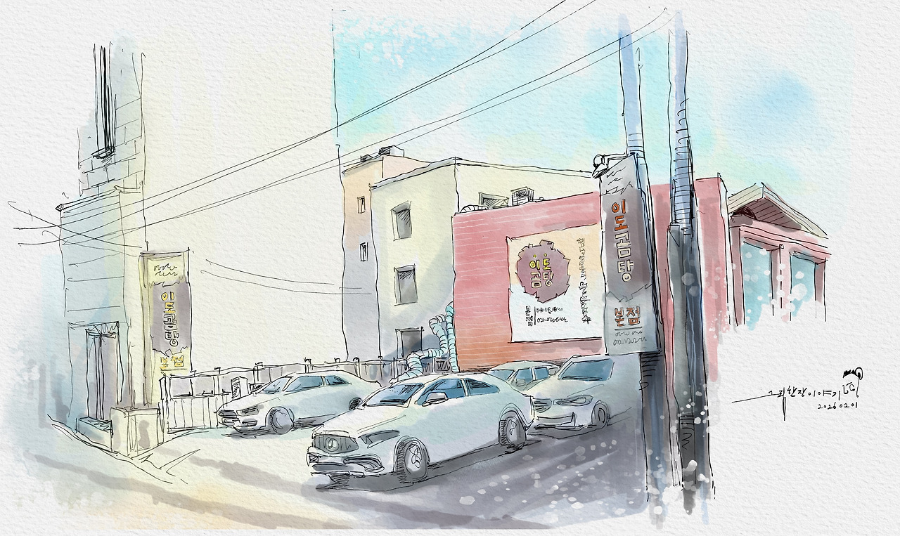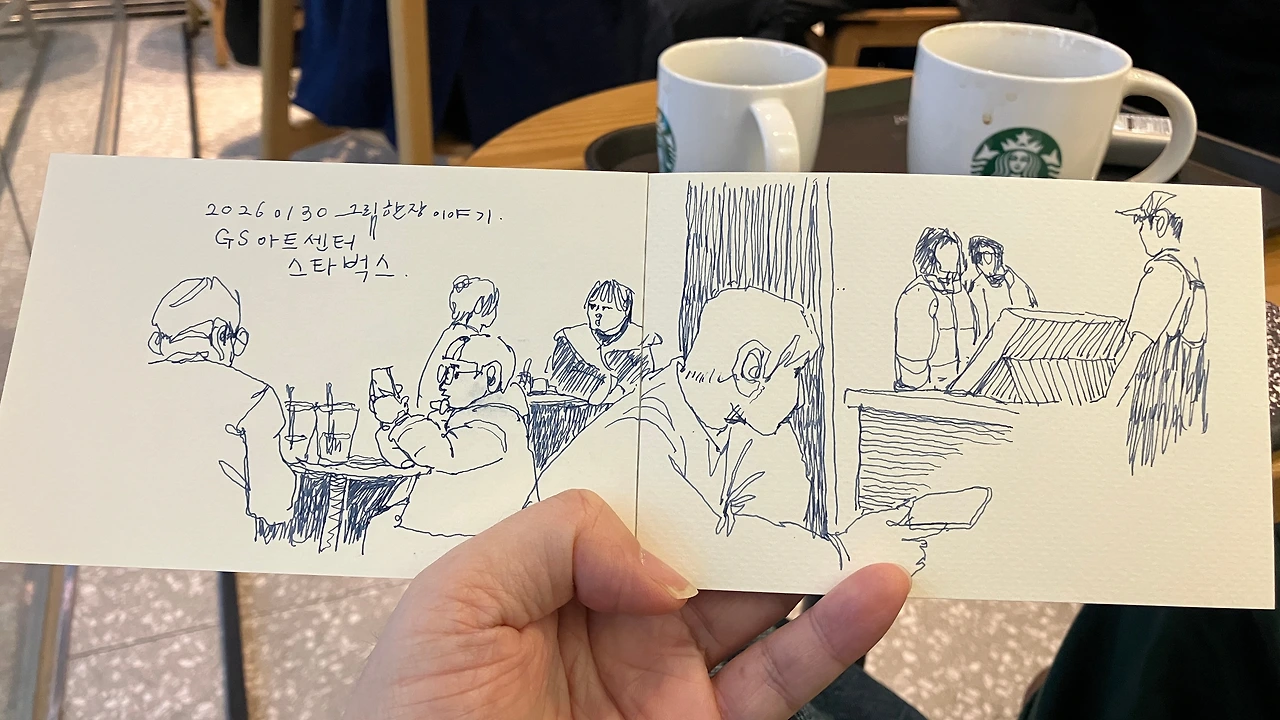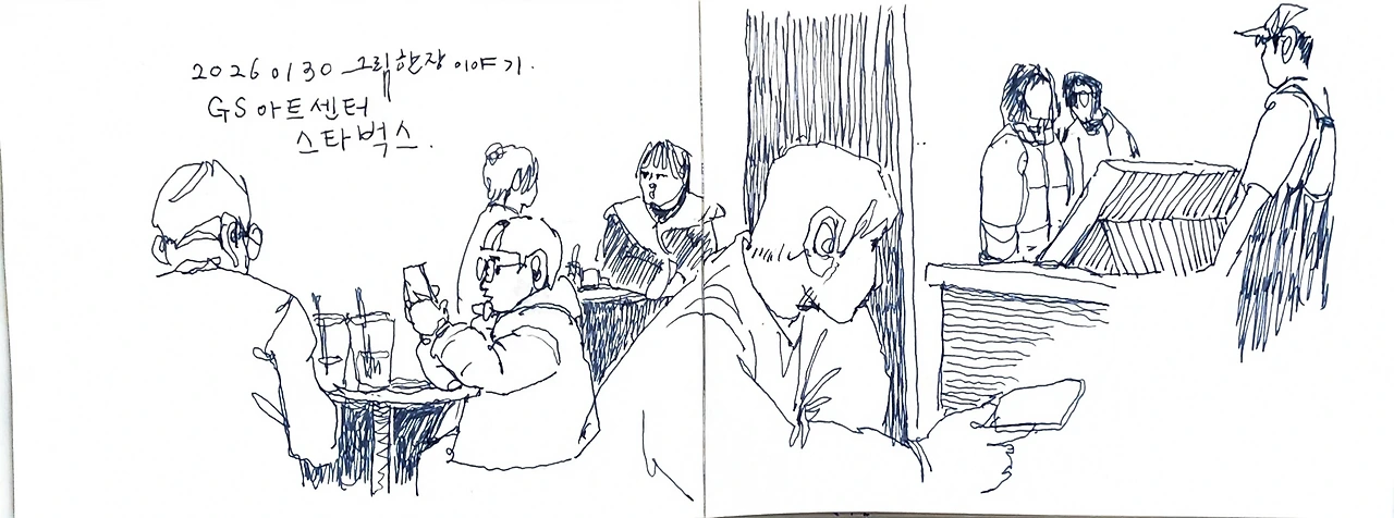 저는 그림을 그렸고 아내는 책을 읽었습니다. 제가 그림을 두 개나 그렸다는 것은 그만큼 시간을 오래 보냈다는 뜻입니다. 역시 오피스 상권이라 점심시간이 지나가자 많은 사람들이 우르르 사무실로 돌아갔습니다. 남들 다 일하는 시간에 여유롭게 앉아있는 제 모습이 불안하면서도 마음 한쪽엔 짜릿한 희열이 지나갔습니다.