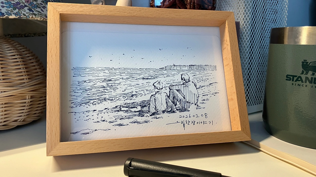 책상 위 액자에는 제가 직접 종이에 그린 펜 드로잉으로 채워집니다. 이번 액자 속 주인공은 영화 [어바웃 타임]의 해변 장면이었습니다. 지금까지 펜 드로잉만으로 만족했는데 이번에는 색을 입히고 싶어 졌습니다